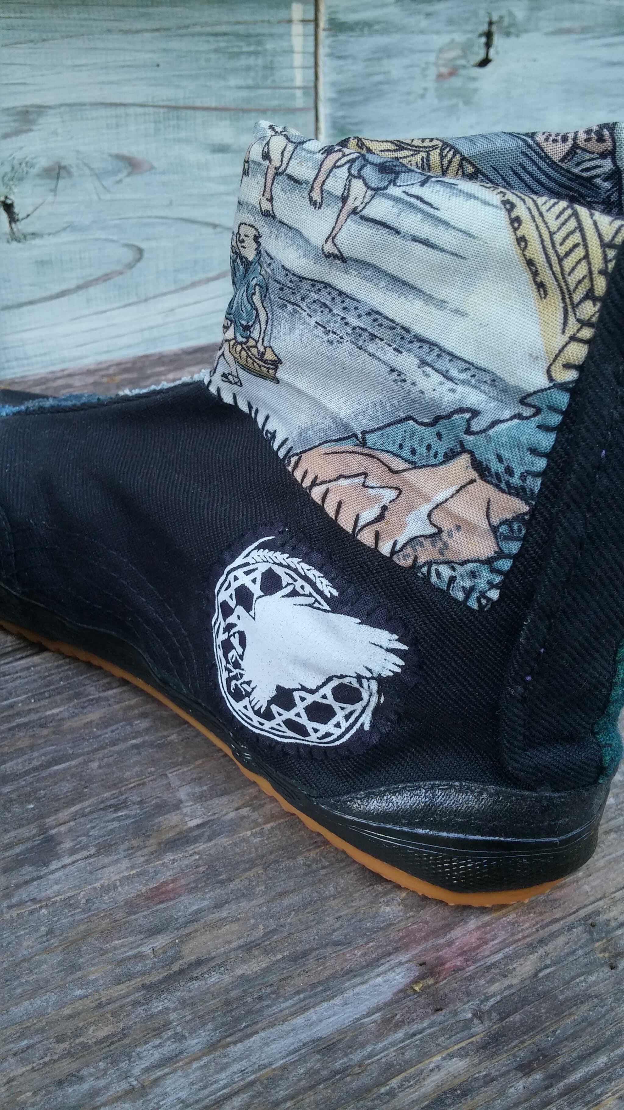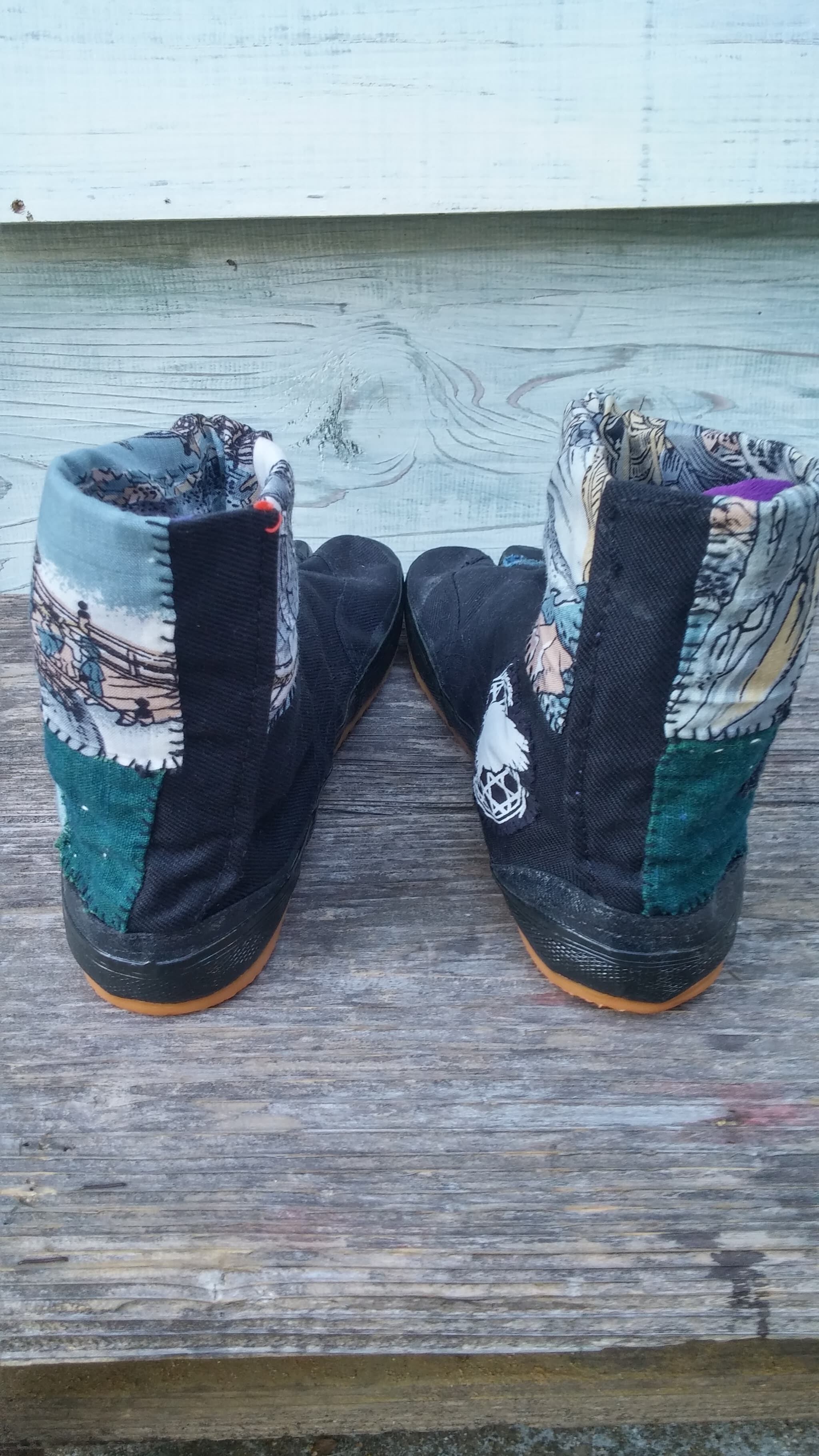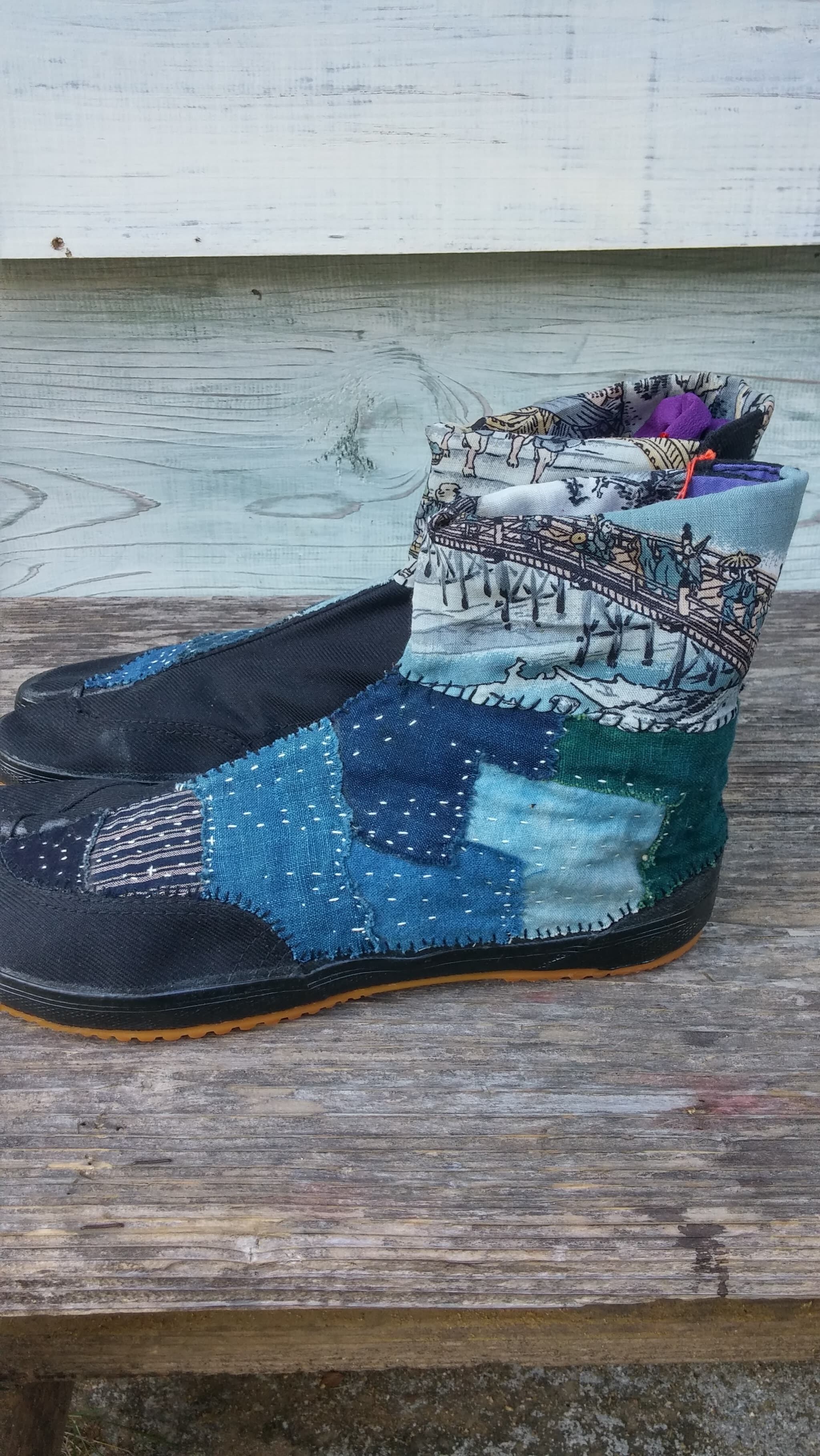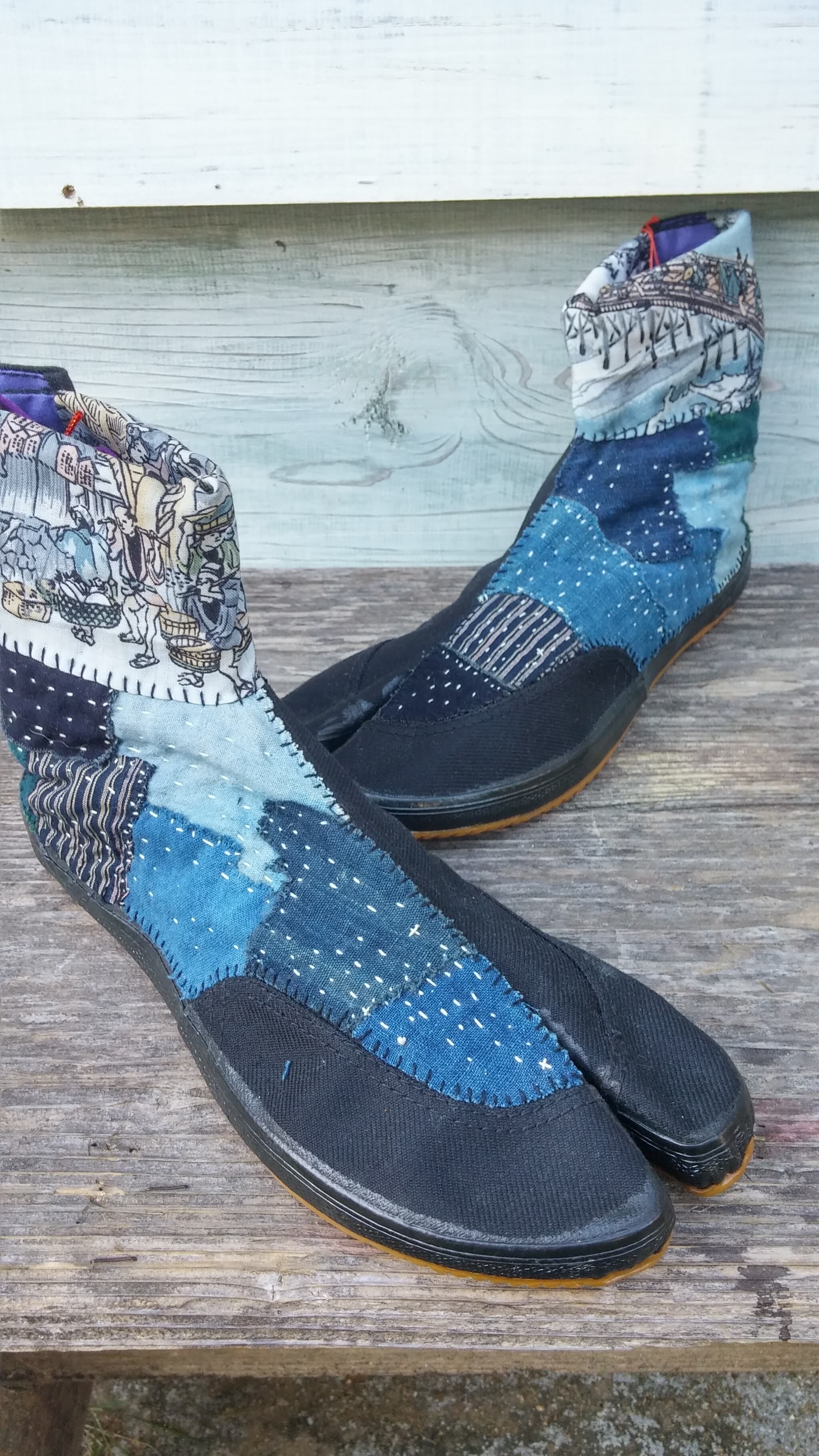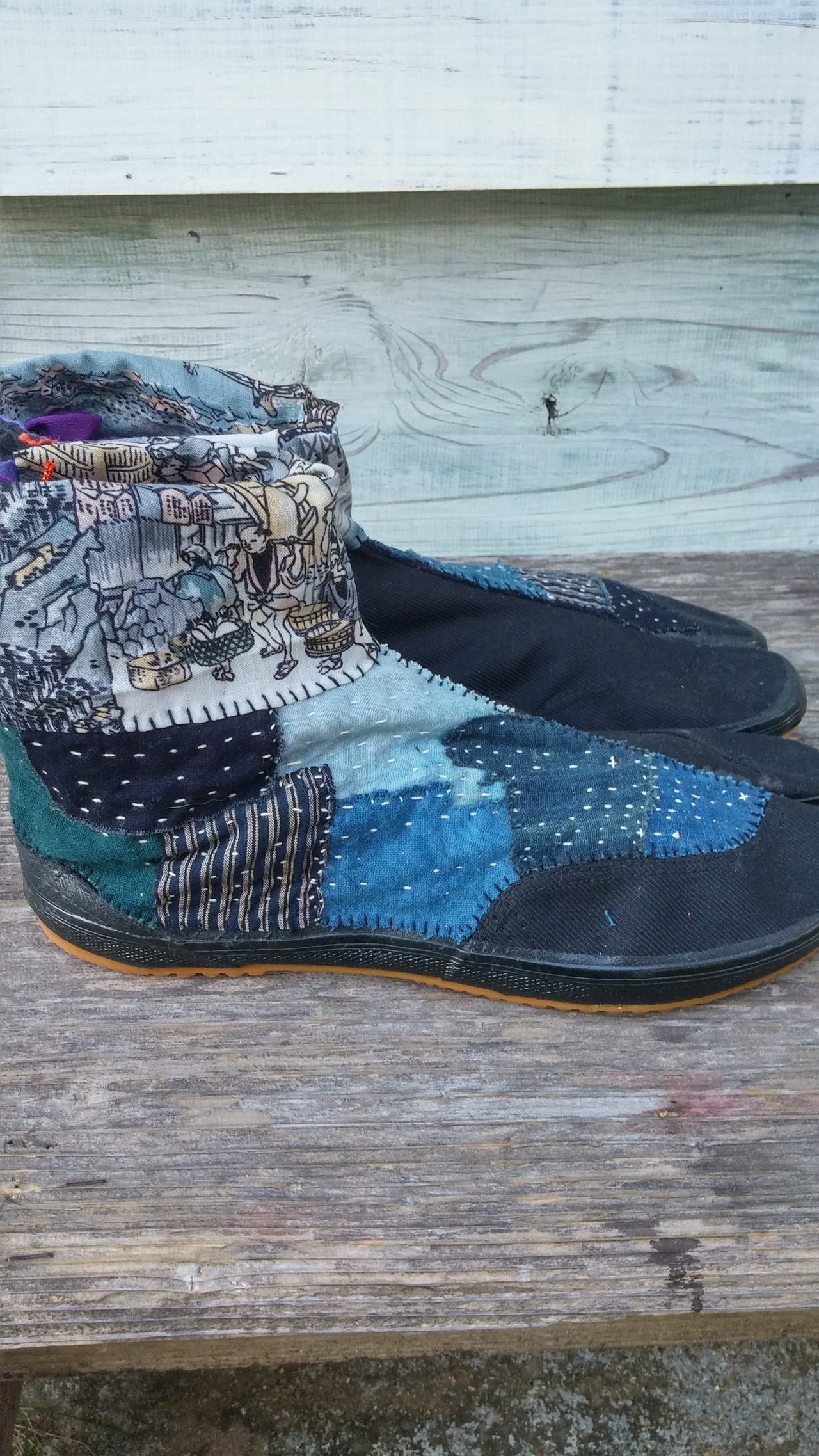 日本の古い藍染めや絣生地を地下足袋にパッチワークし刺し子を一点一点手作業で施しております。