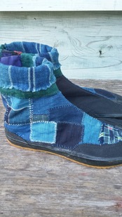 日本の古い藍染めや絣生地を地下足袋にパッチワークし刺し子を一点一点手作業で施しております。