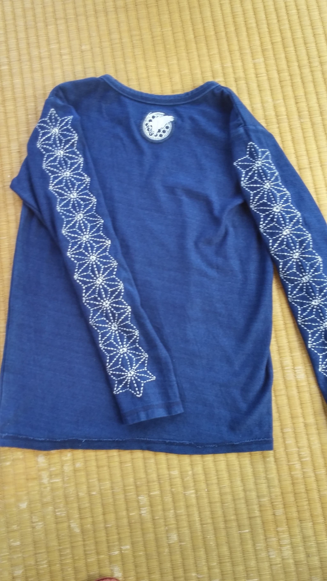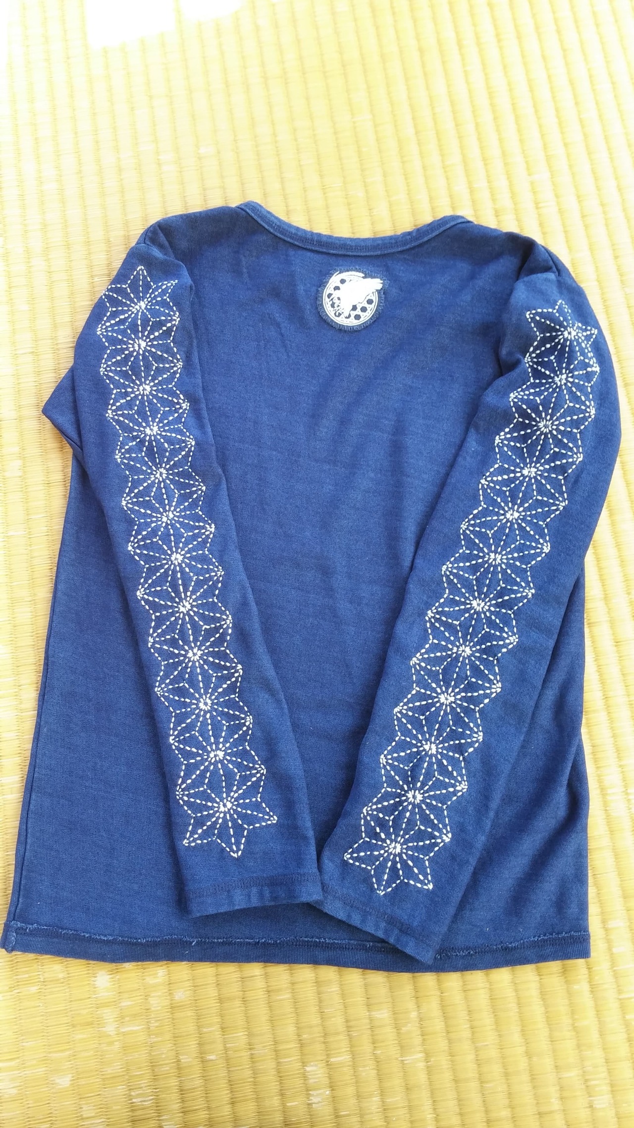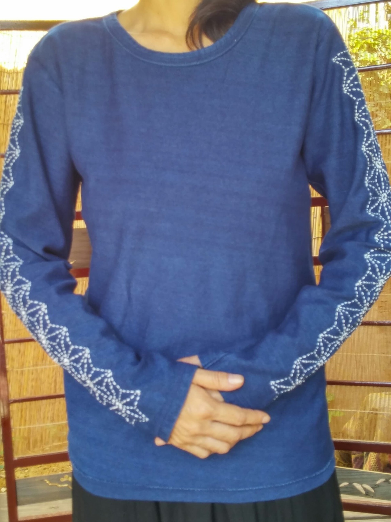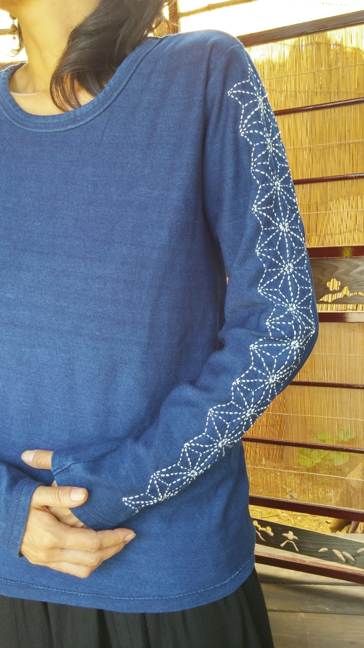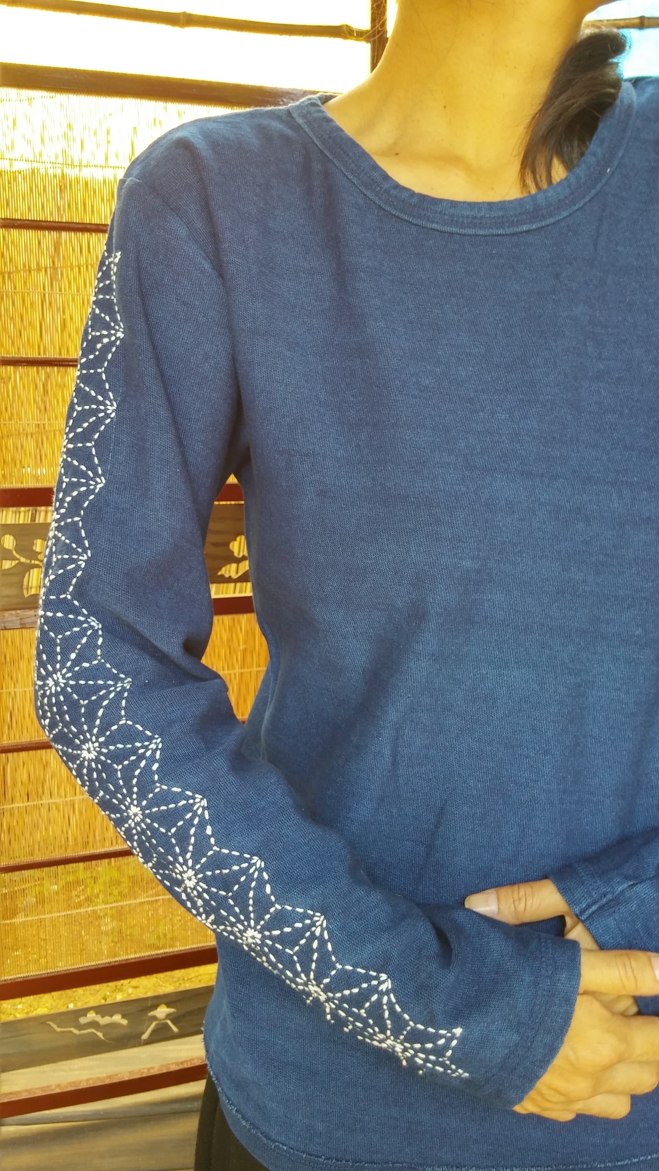 藍染めのLong-Tshirtに日本の伝統「麻の葉」柄をハンドメイドで一針一針刺し子いたしました。