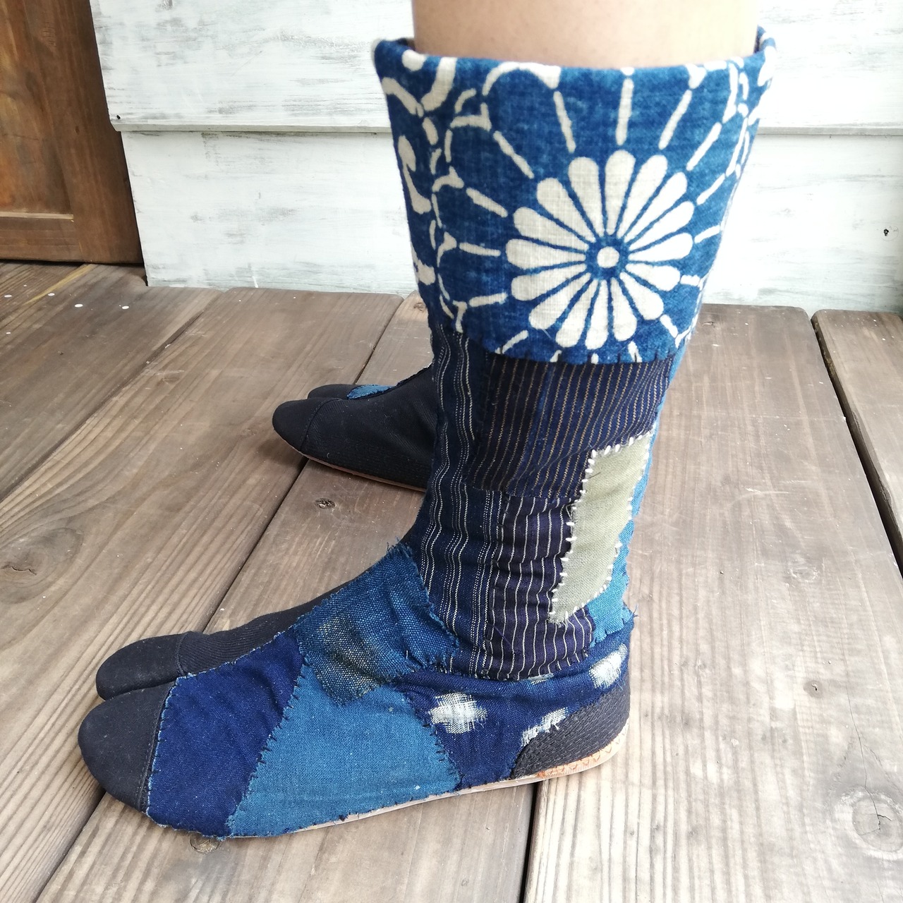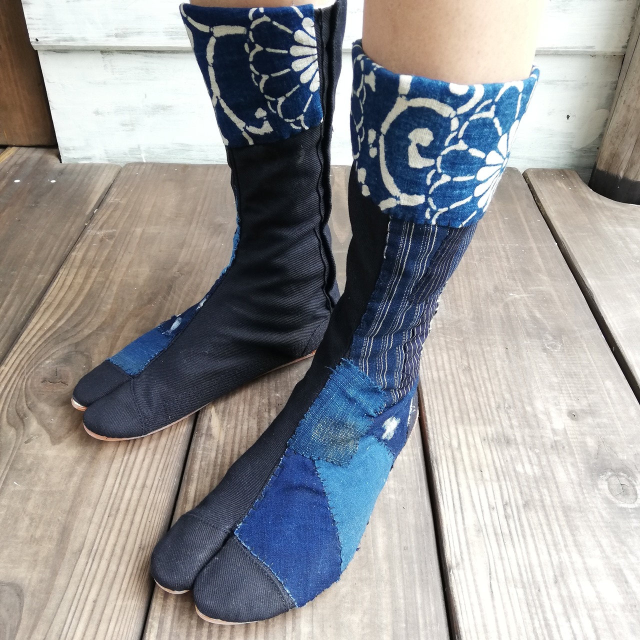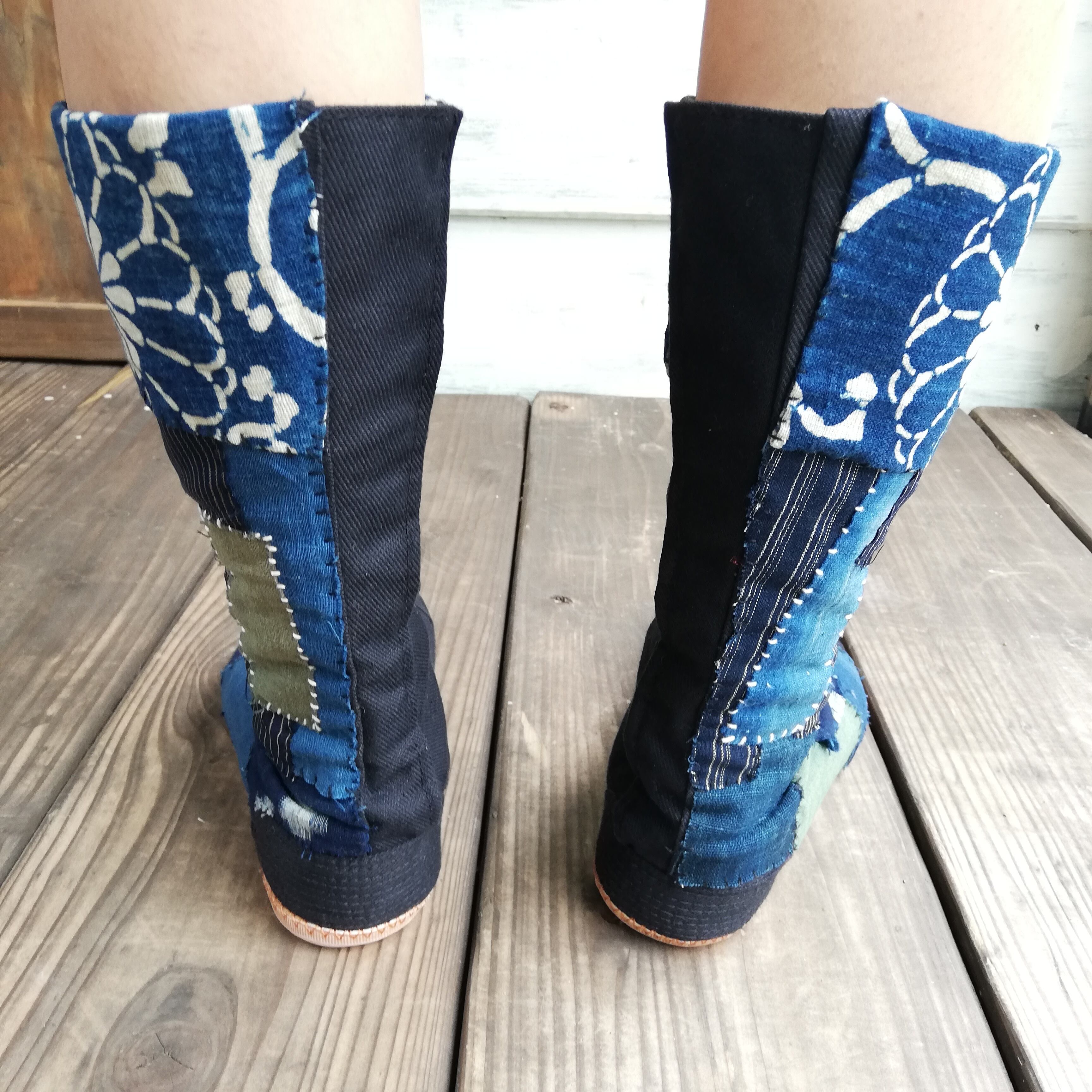 日本の古い藍染めや絣生地を地下足袋にパッチワークし刺し子を一点一点手作業で施しております。