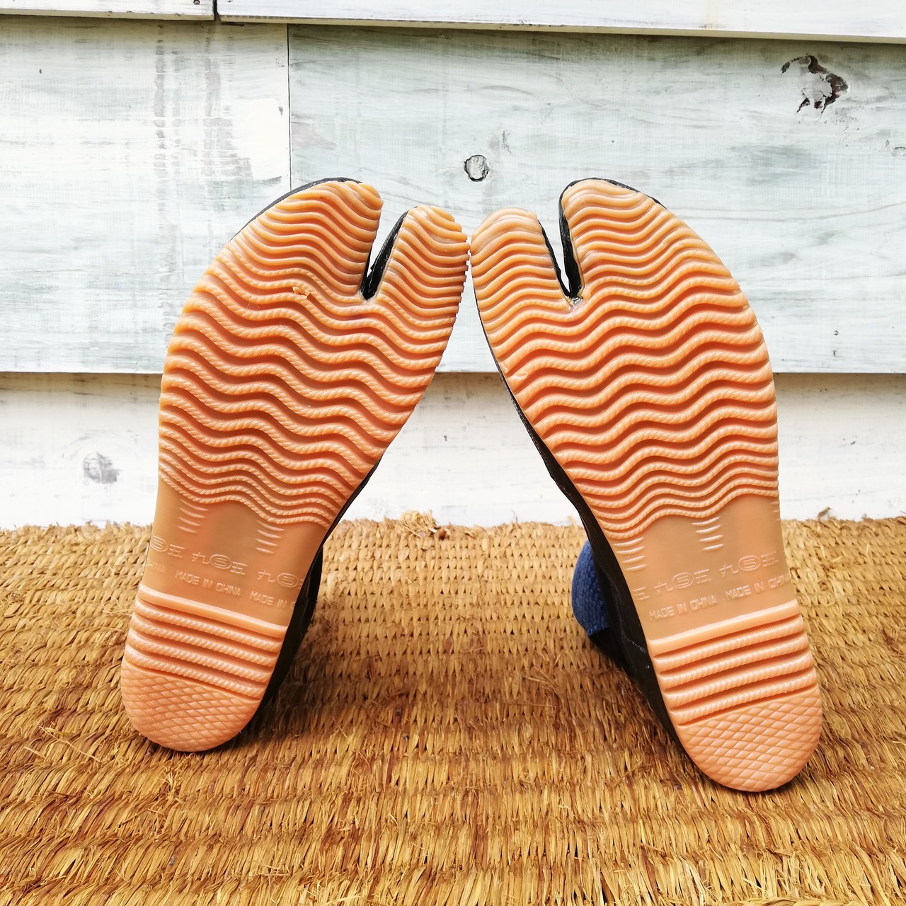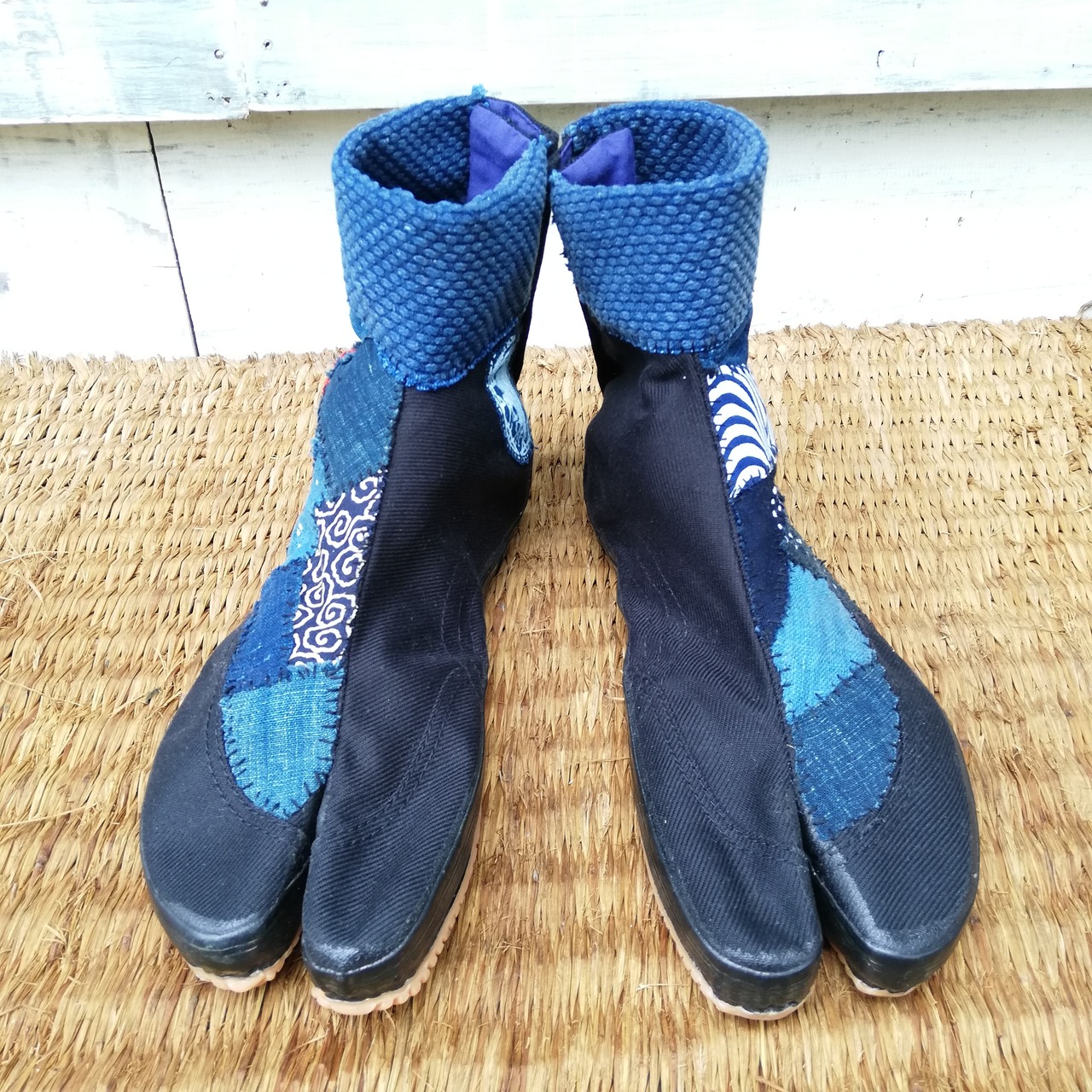 日本の古い藍染めや絣生地を地下足袋にパッチワークし刺し子を一点一点手作業で施しております。