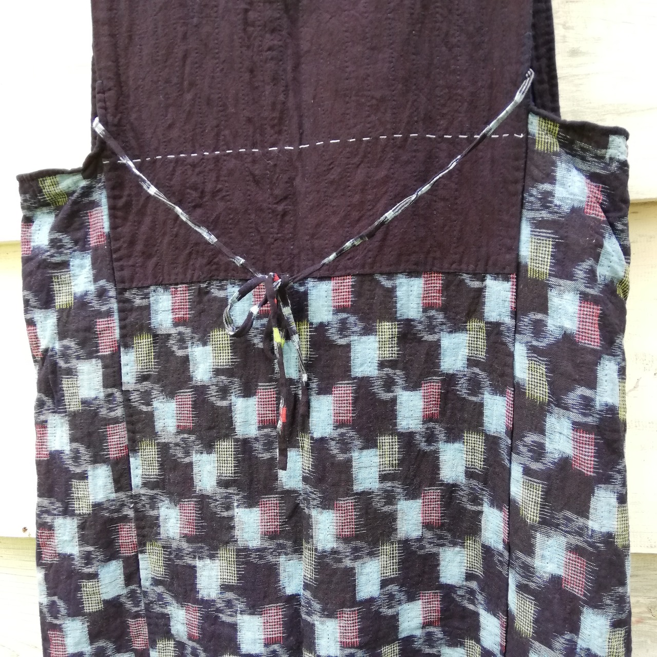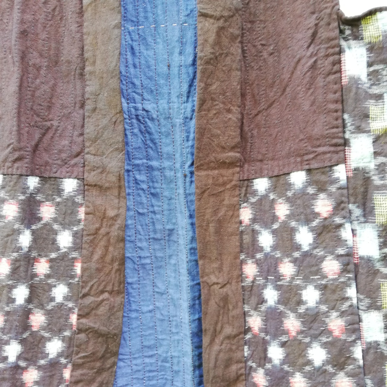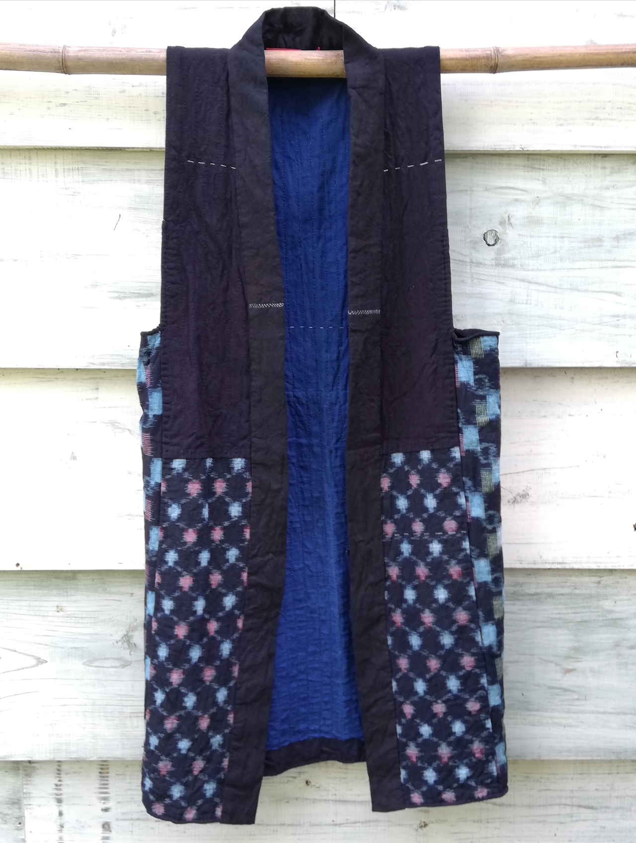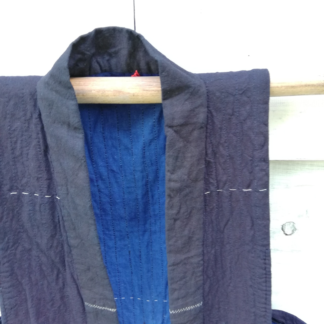 ミシン縫いの様に見えますが、良く見ると全て手縫いでした。針を刺す人の人柄が分かる様な気がしますね。濃いめの藍染と絣織りが綺麗な一枚です。