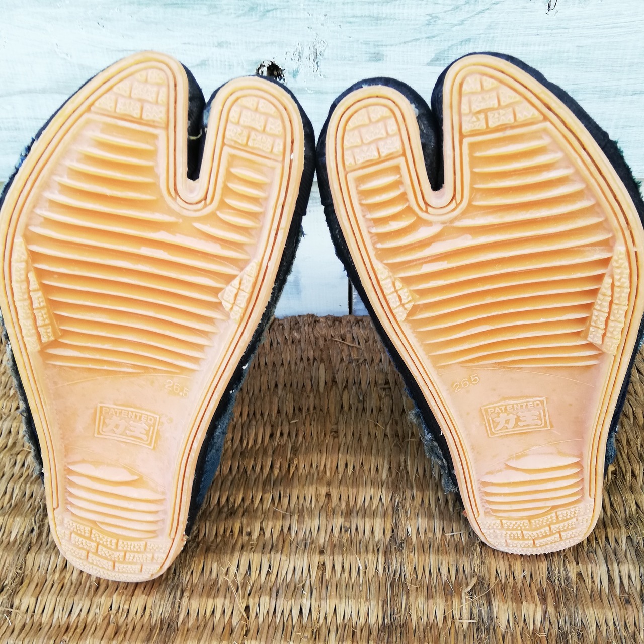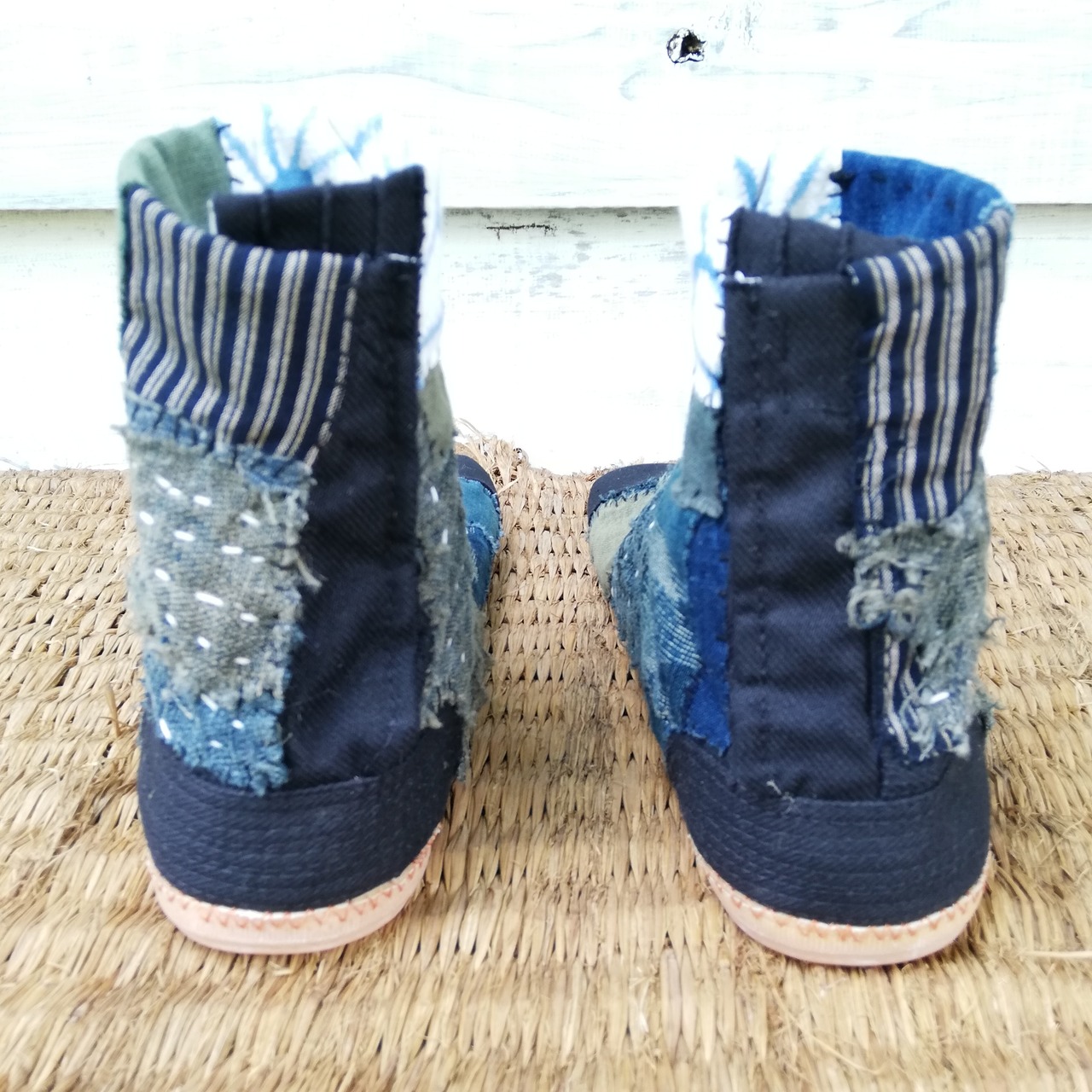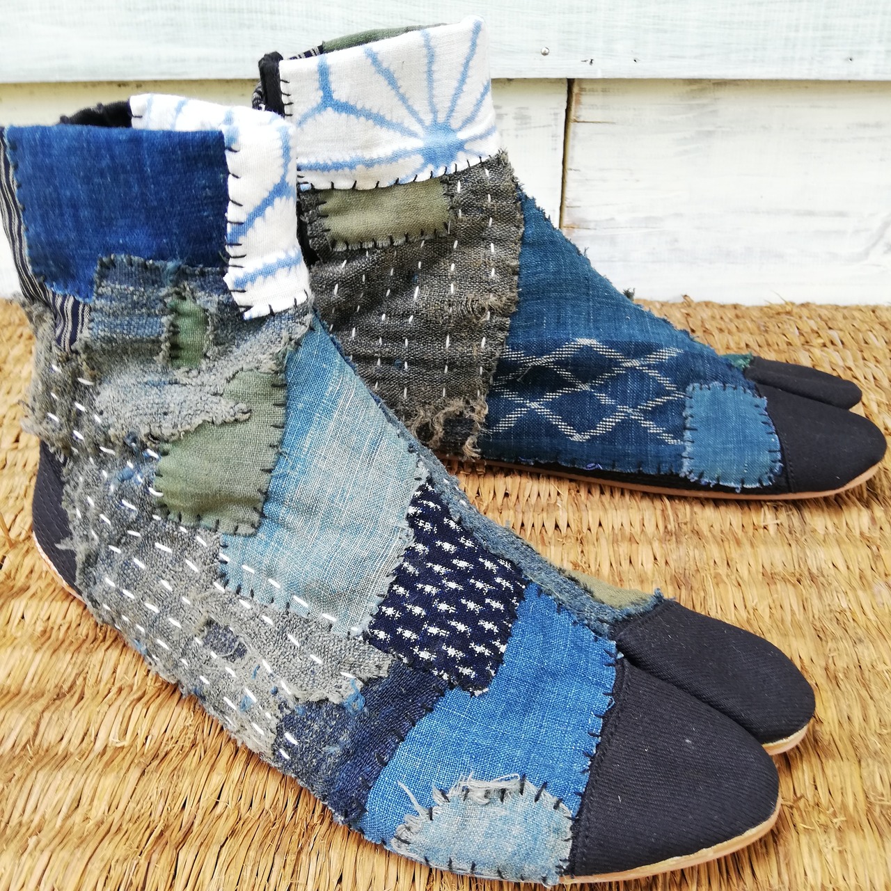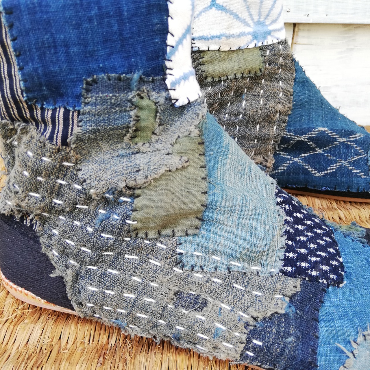 日本の古い藍染めや絣生地を地下足袋にパッチワークし刺し子を一点一点手作業で施しております。