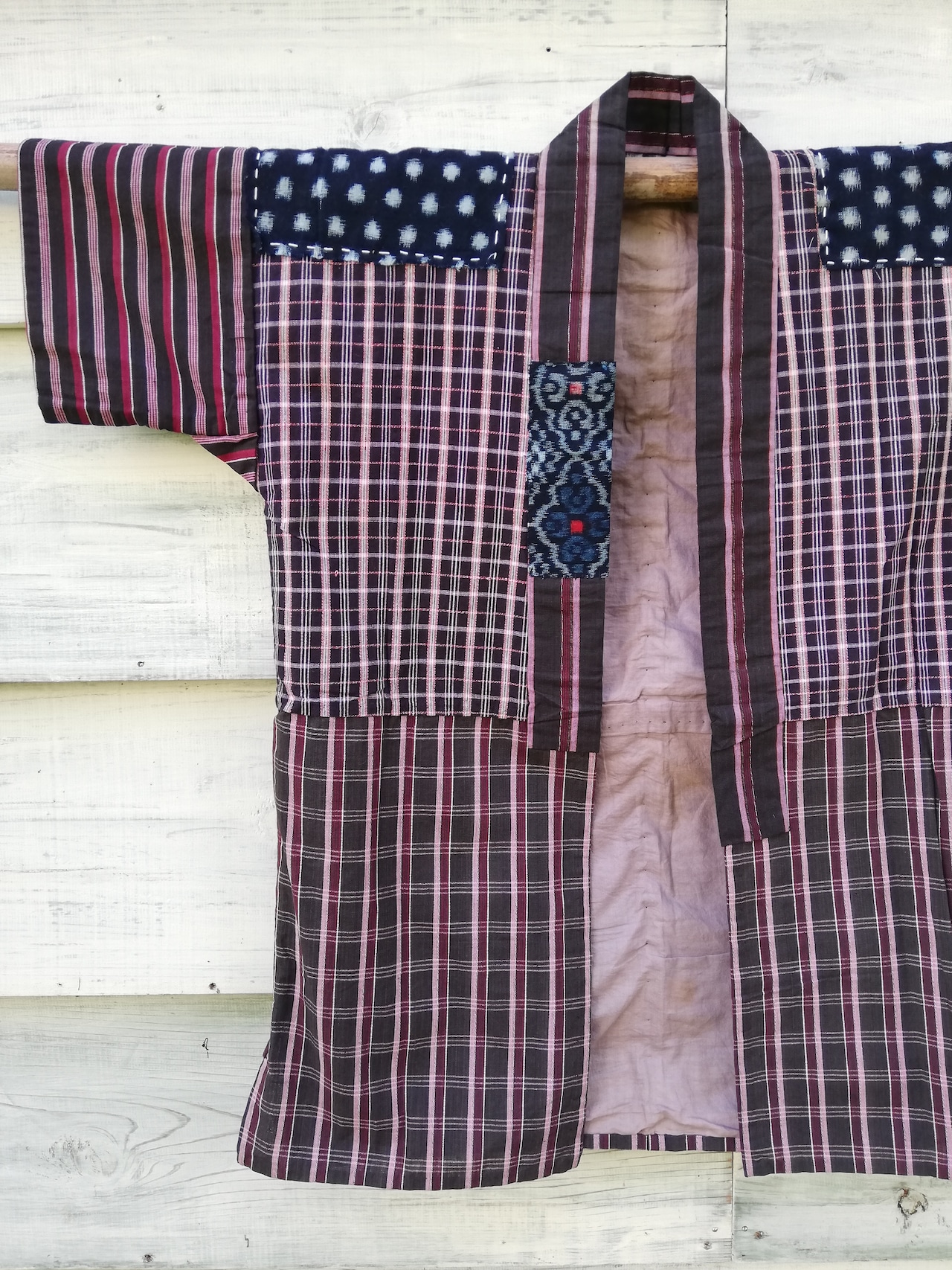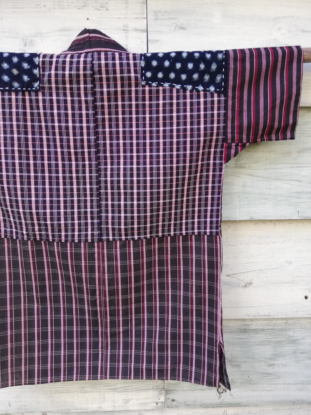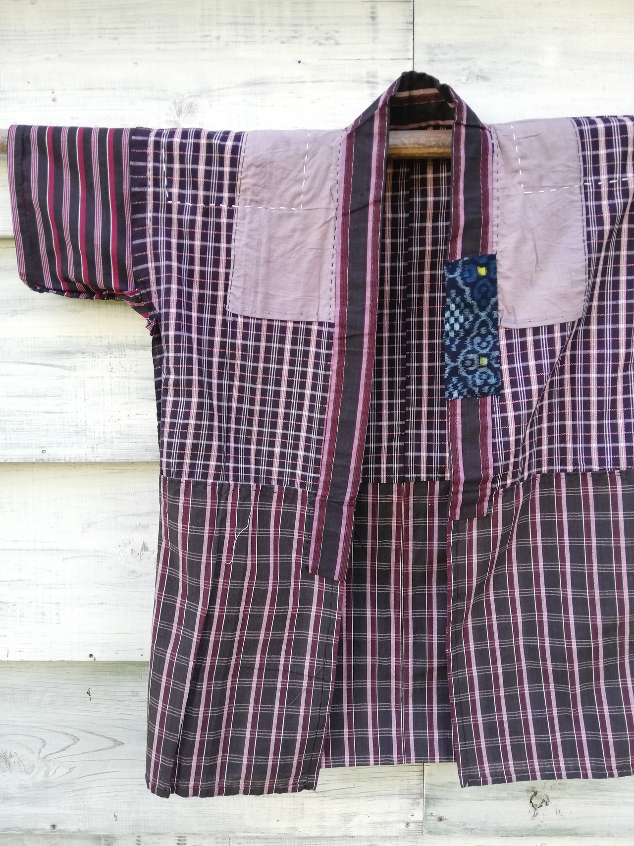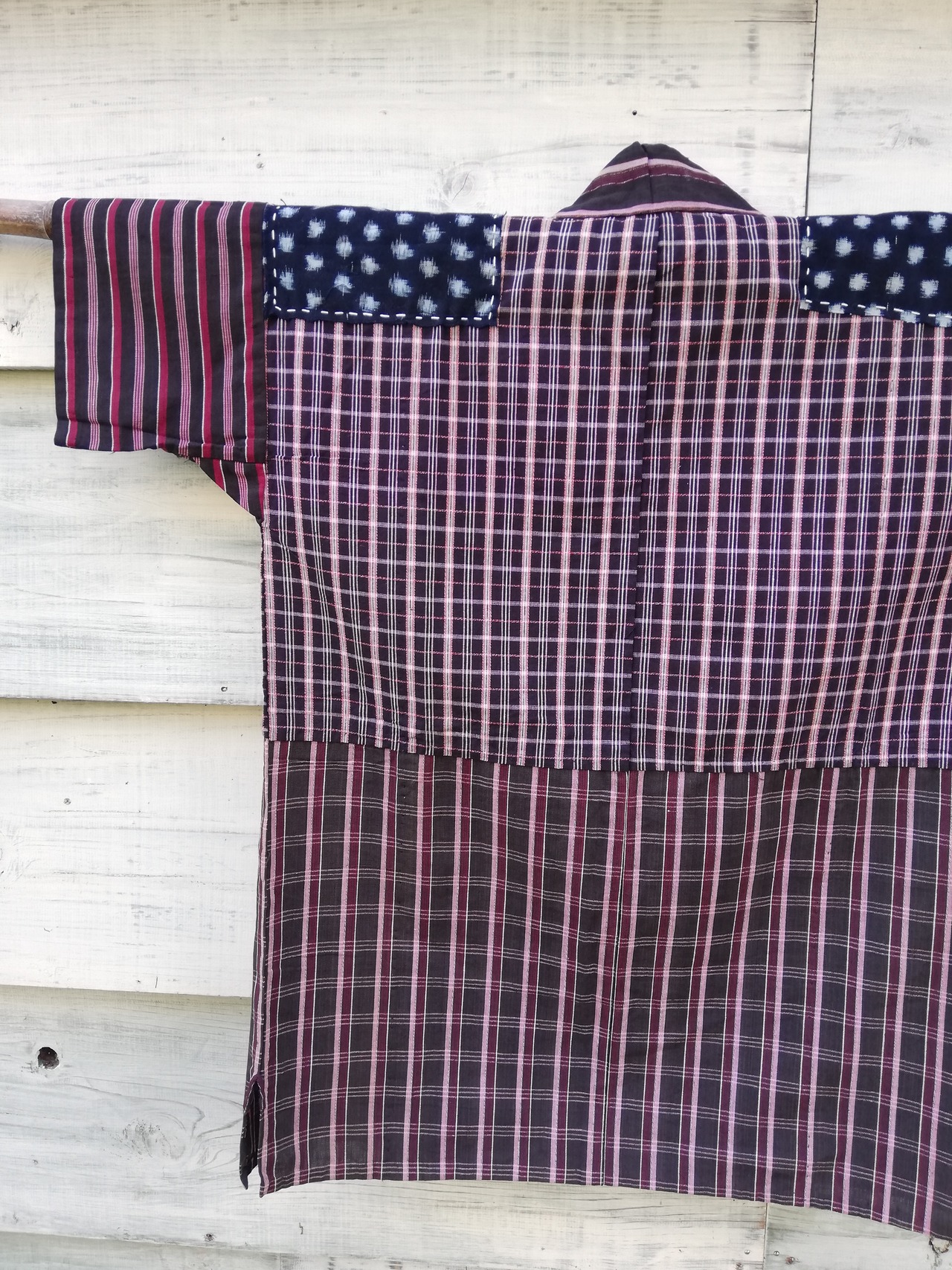 年代不明ですが麻の生地がとてもしっかりとした着心地かと思われます。襟元と両肩には絣の古布をあてました。