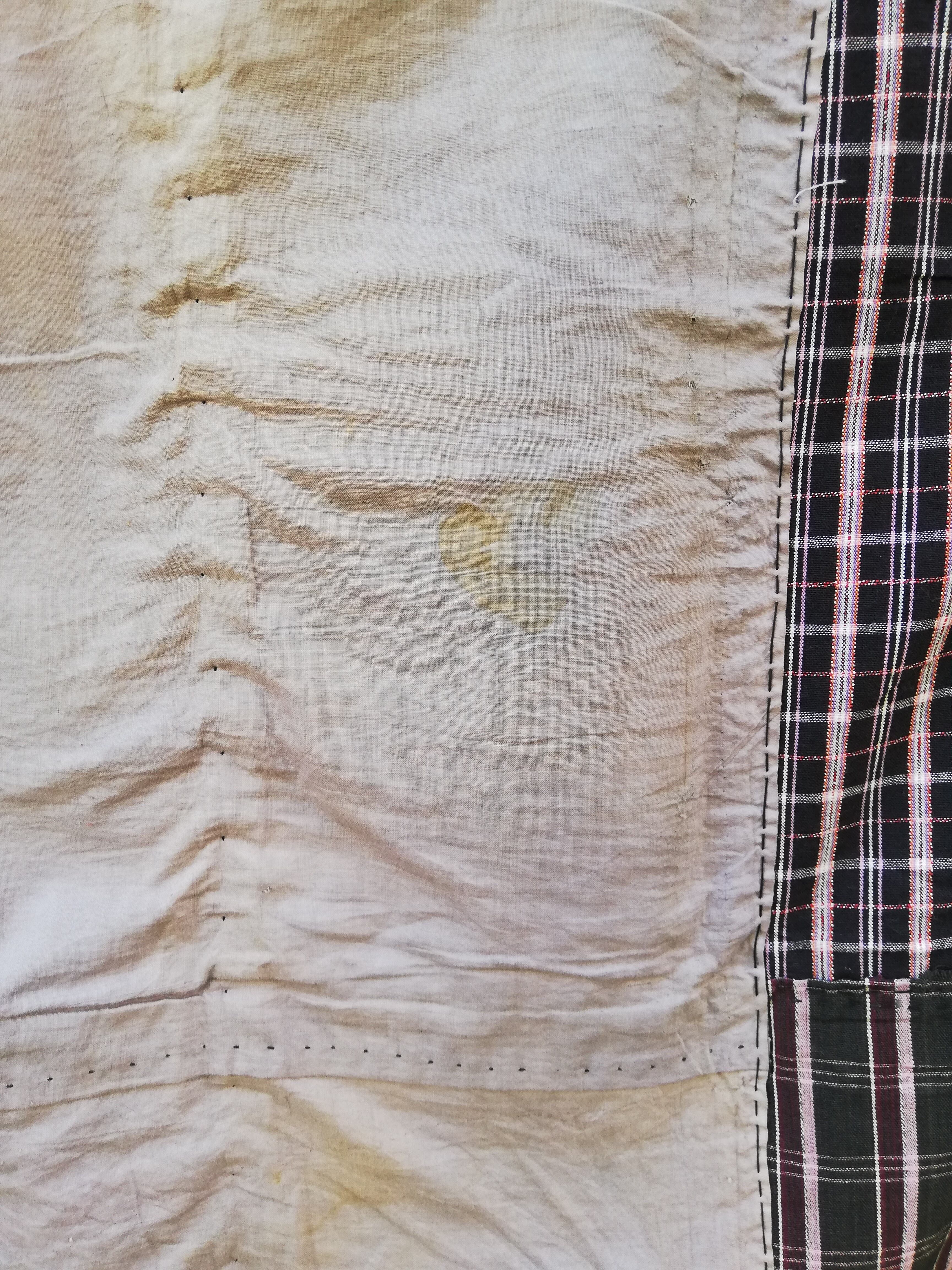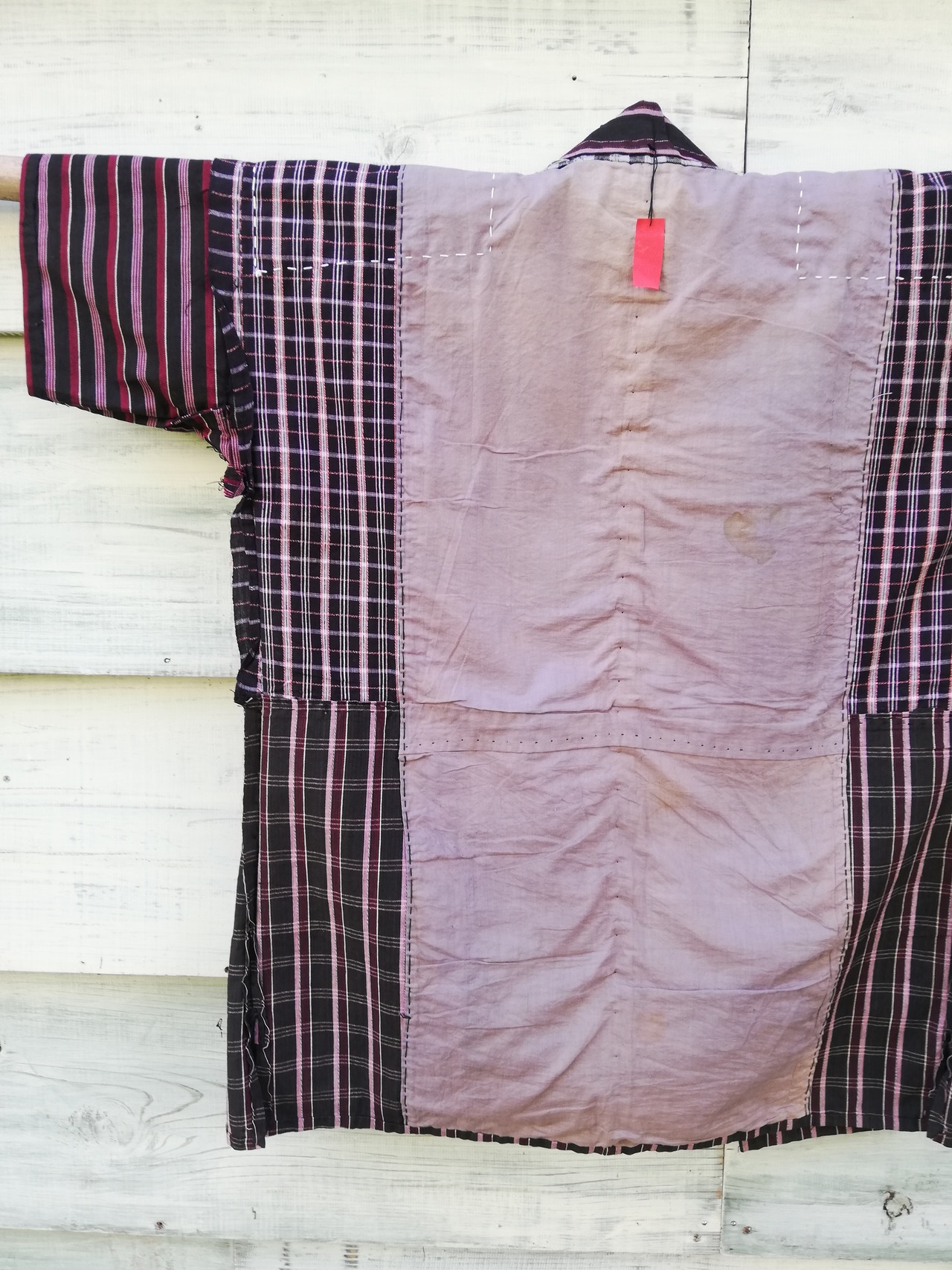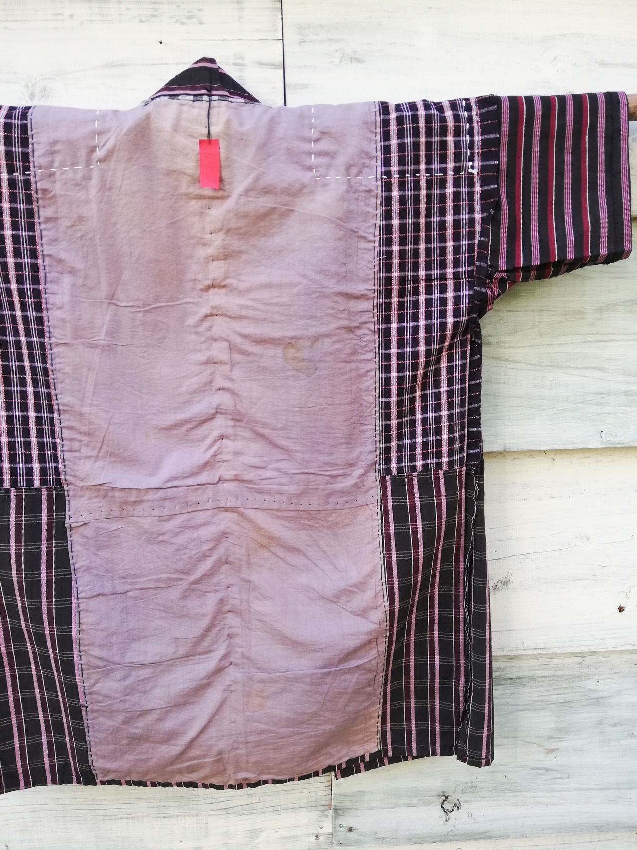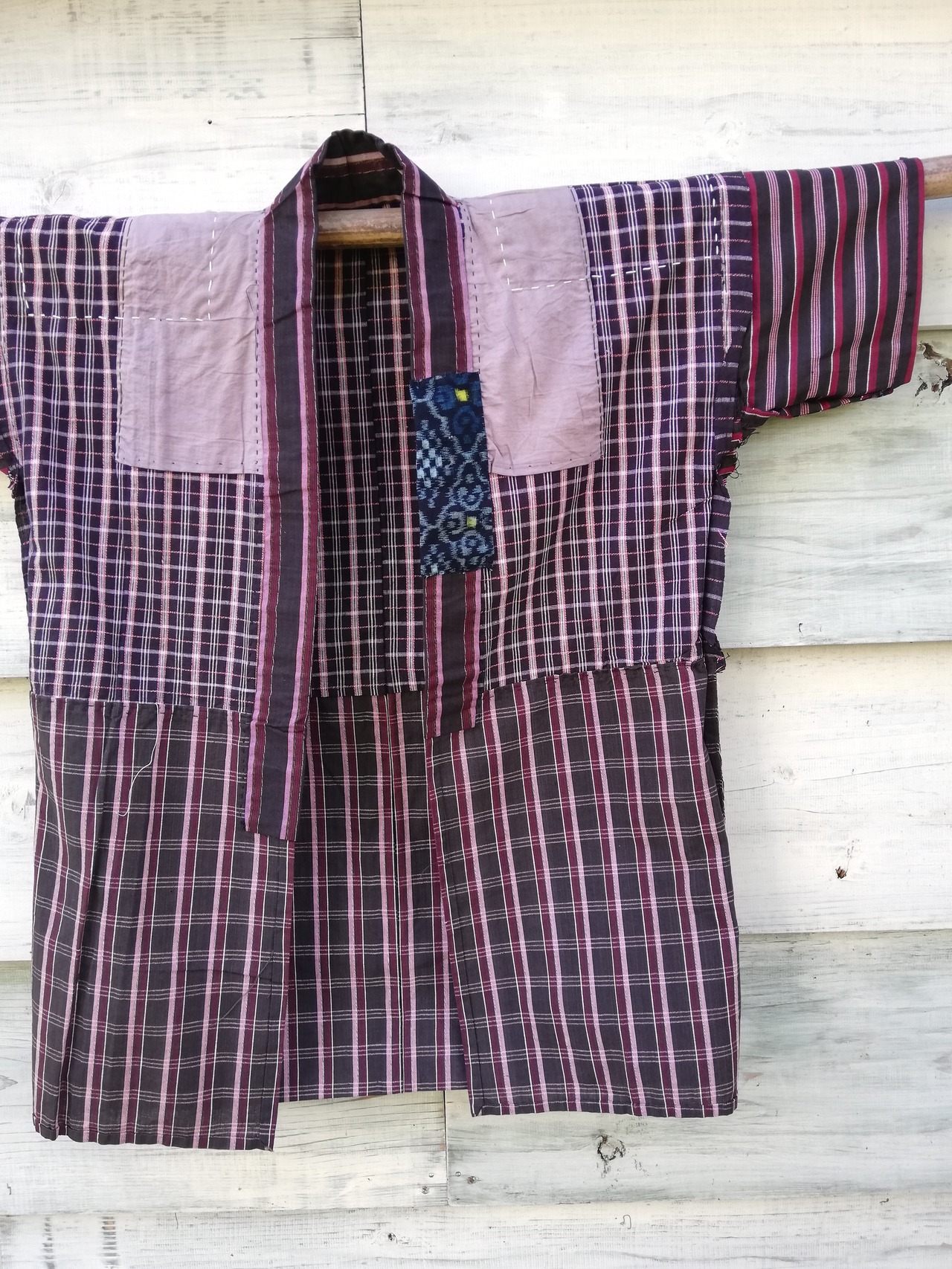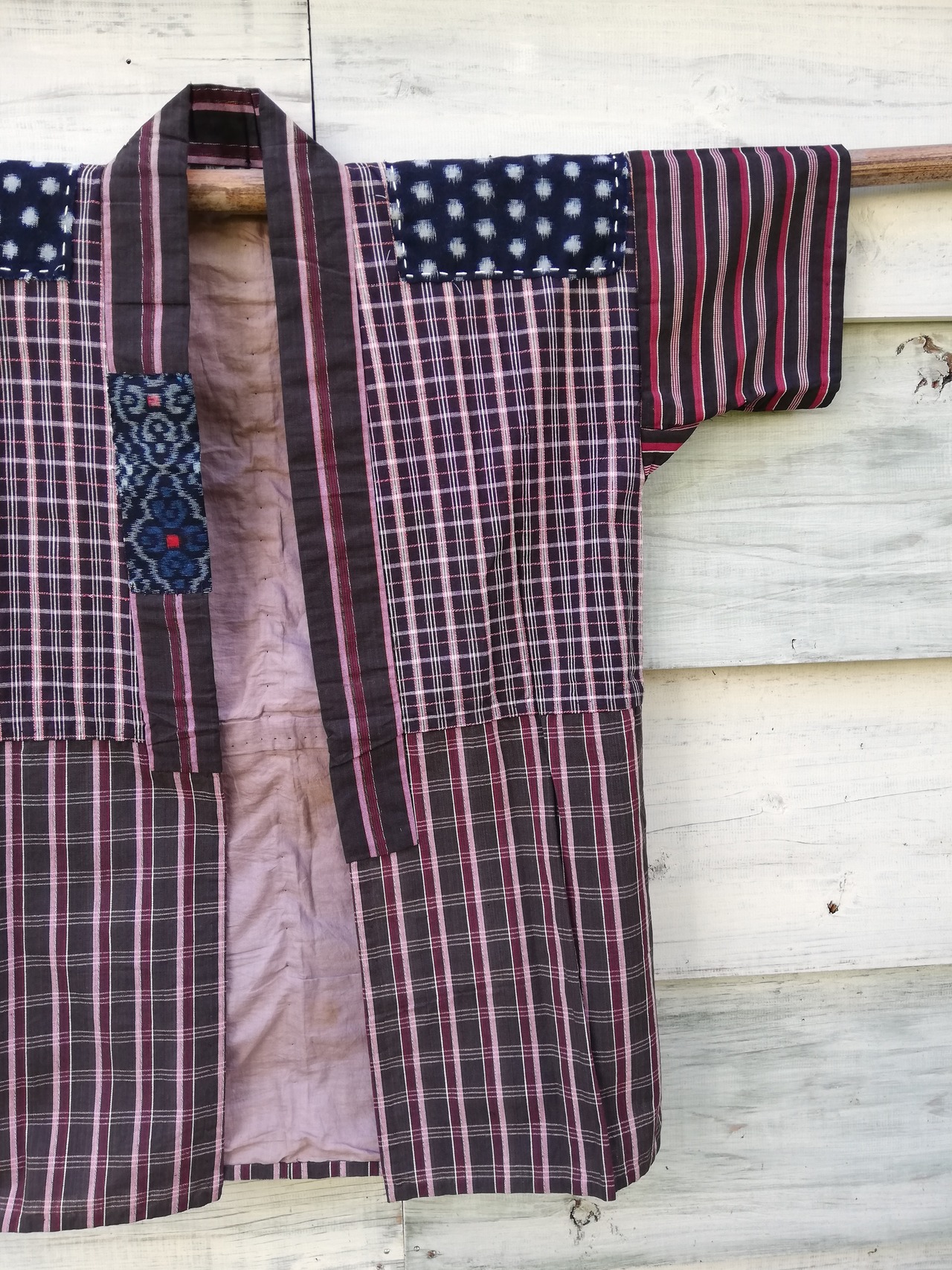 年代不明ですが麻の生地がとてもしっかりとした着心地かと思われます。襟元と両肩には絣の古布をあてました。