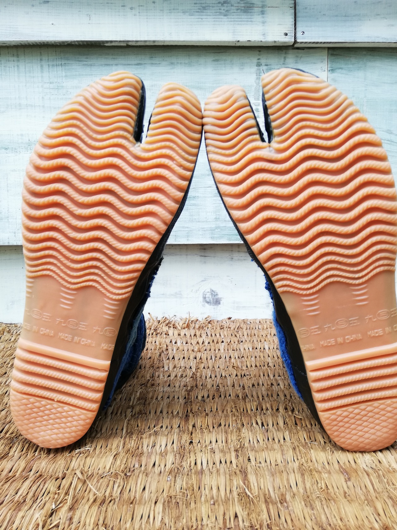 日本の古い藍染めや絣生地を地下足袋にパッチワークし刺し子を一点一点手作業で施しております。