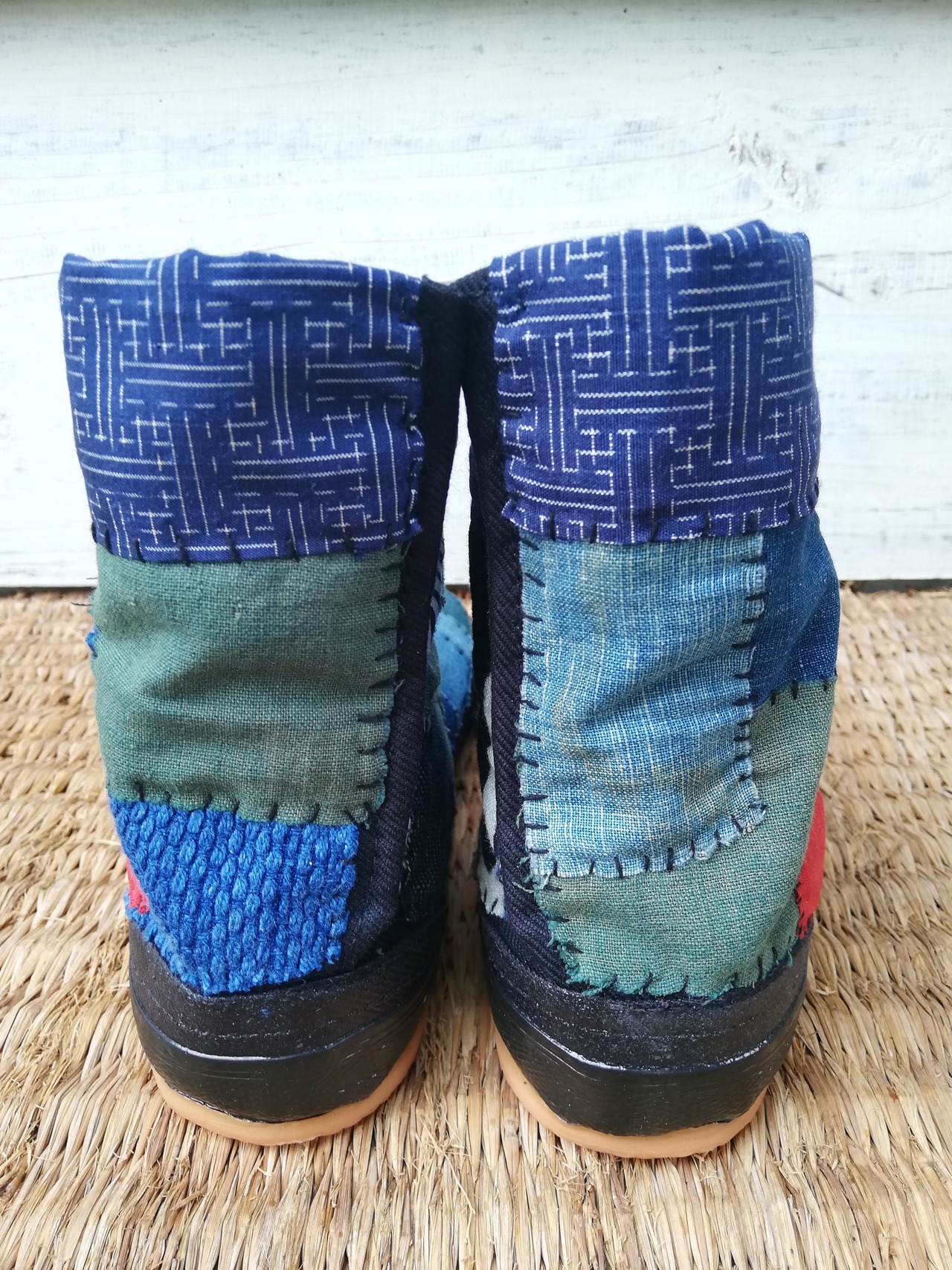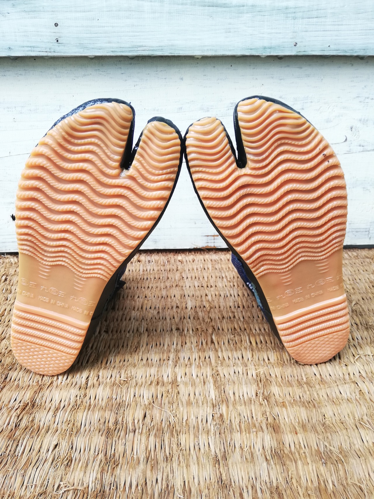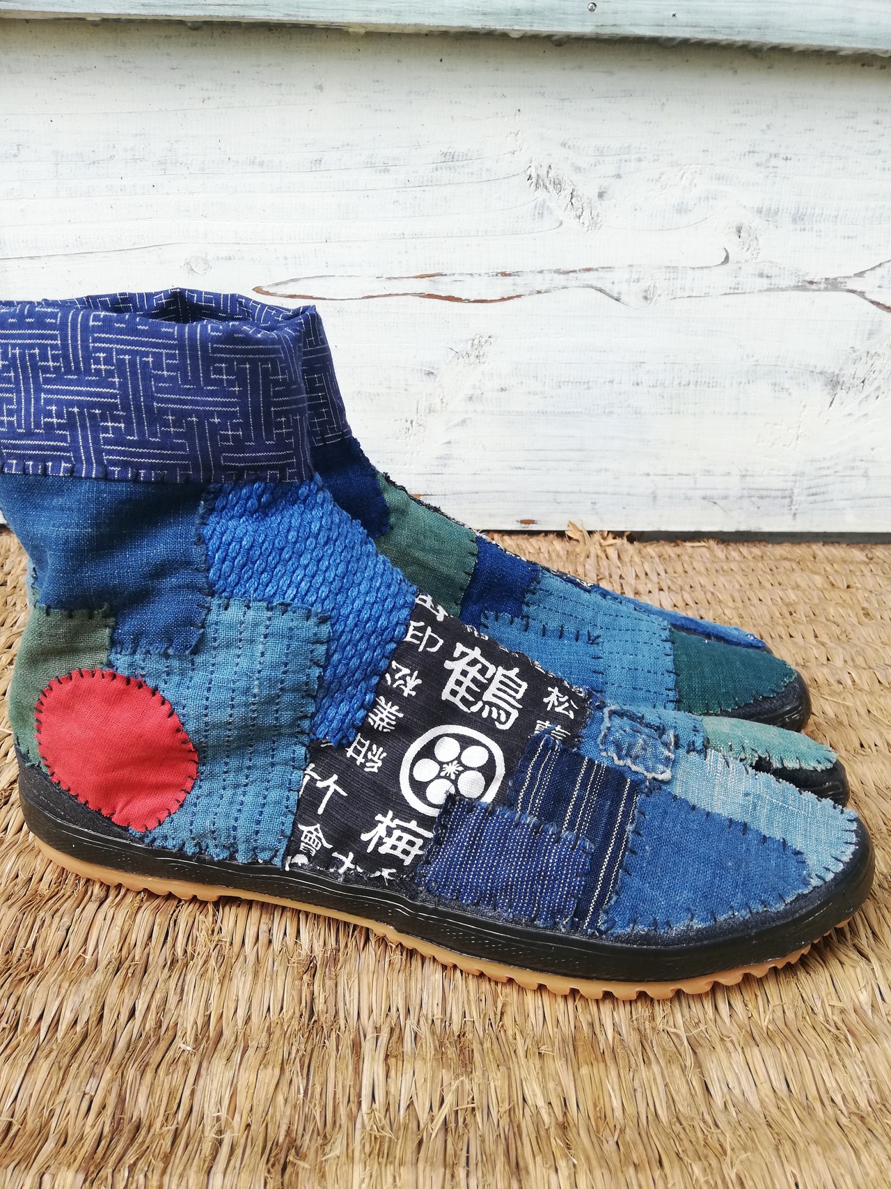日本の古い藍染めや絣生地を地下足袋にパッチワークし刺し子を一点一点手作業で施しております。