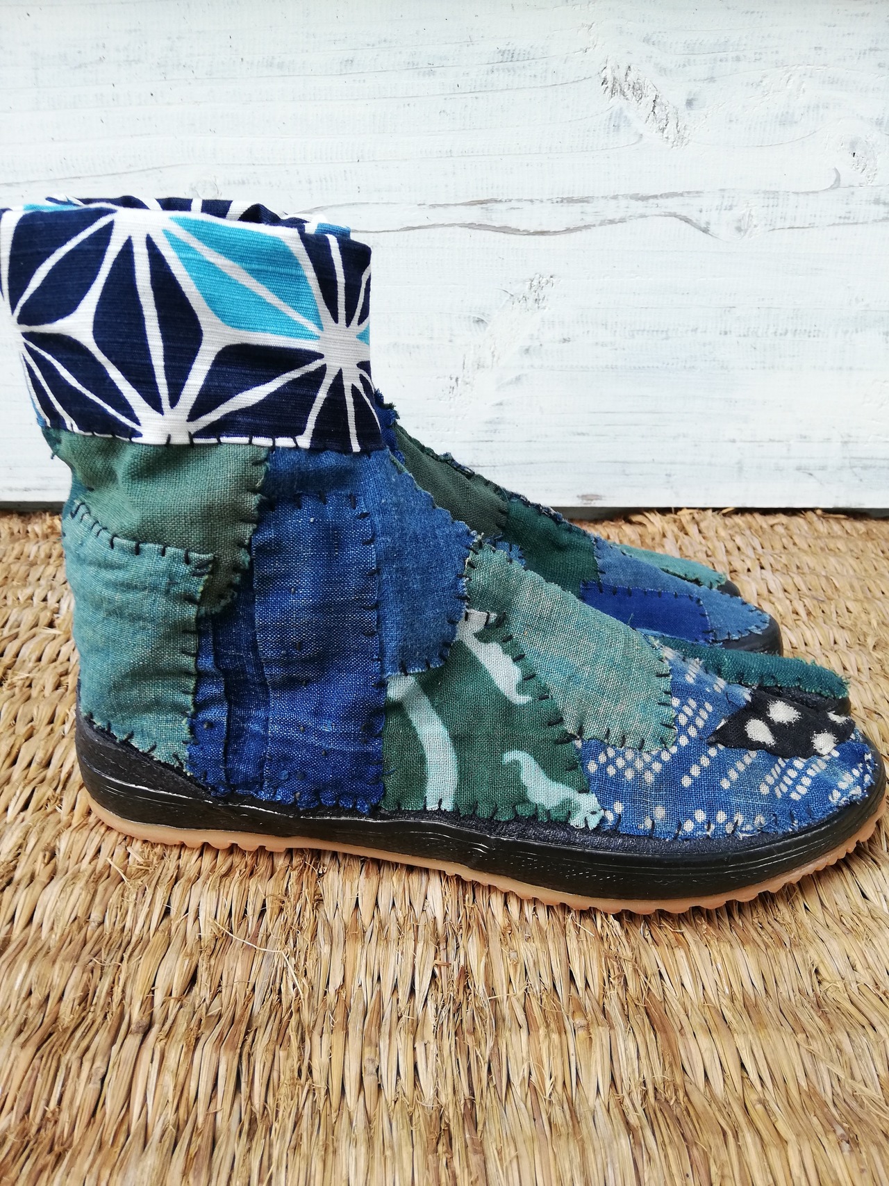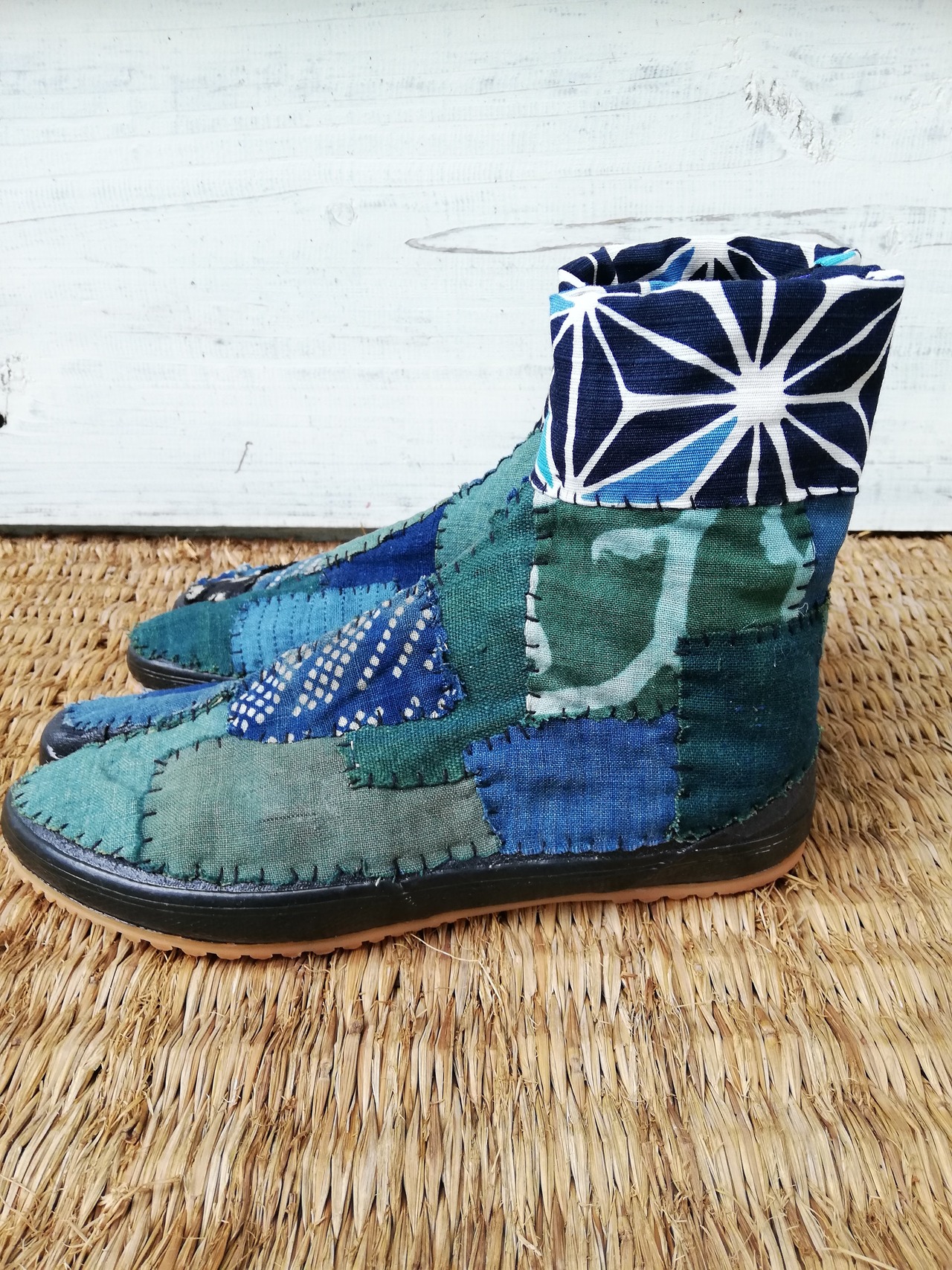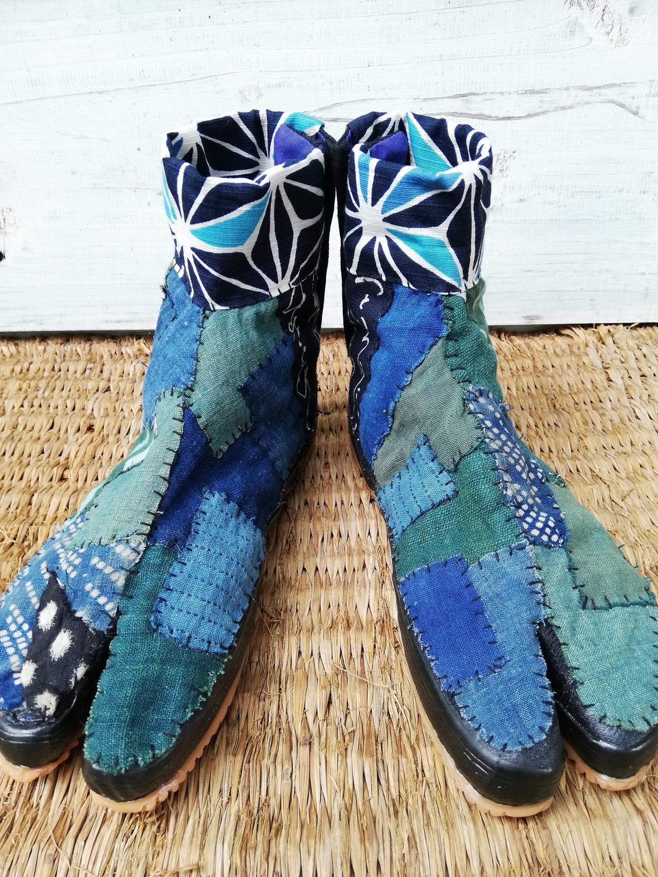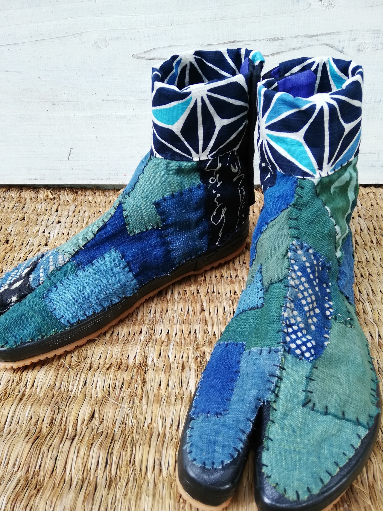 日本の古い藍染めや絣生地を地下足袋にパッチワークし刺し子を一点一点手作業で施しております。