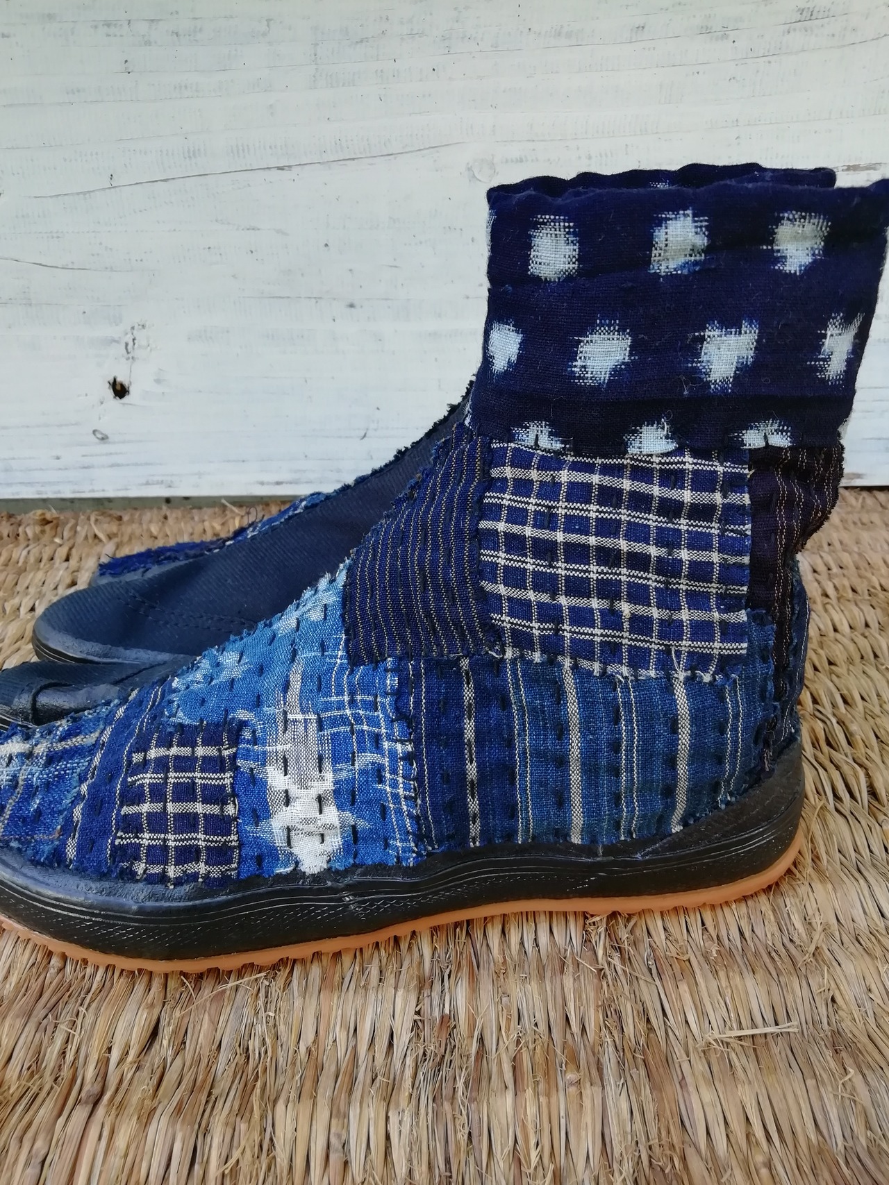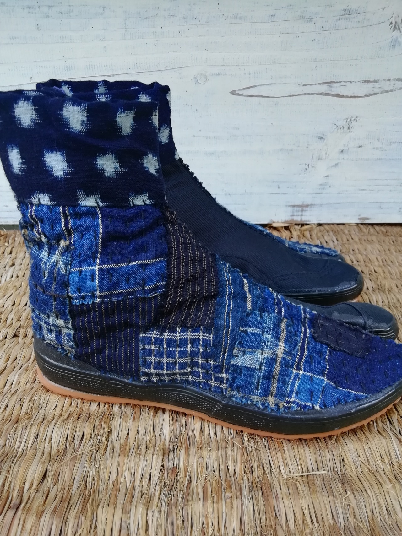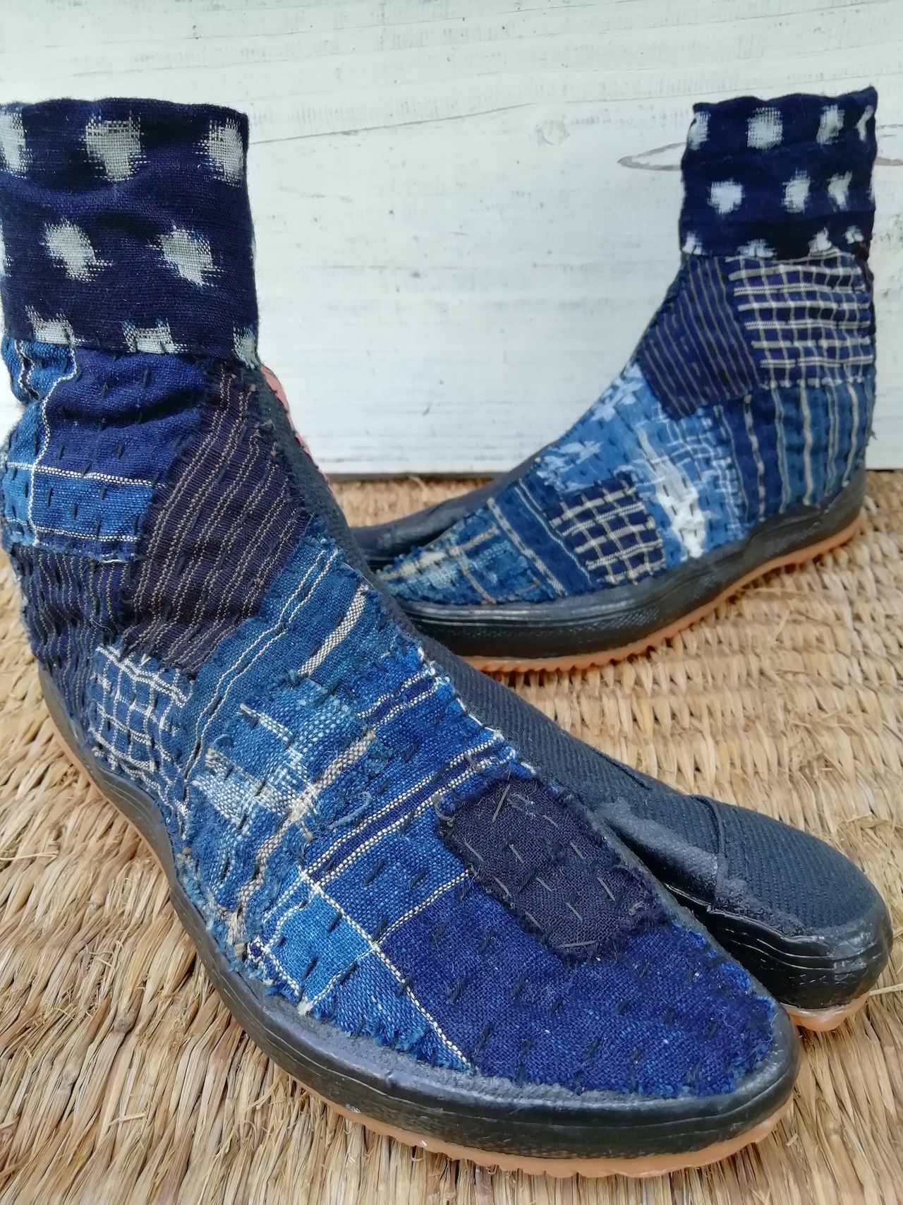 日本の古い藍染めや絣生地を地下足袋にパッチワークし刺し子を一点一点手作業で施しております。