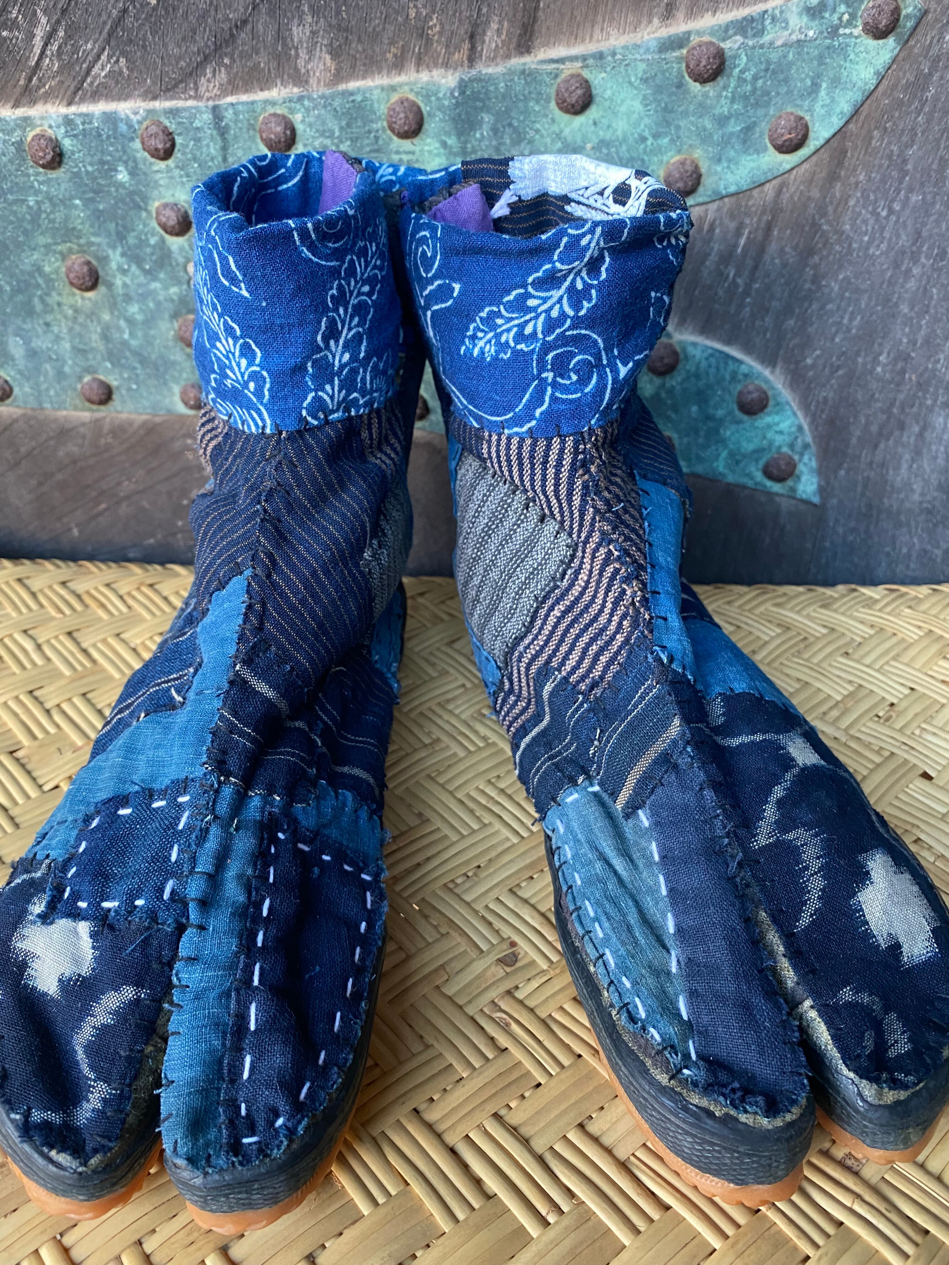 古い藍染めや絣生地を地下足袋にパッチワークし刺し子を一点一点手作業で施しております。