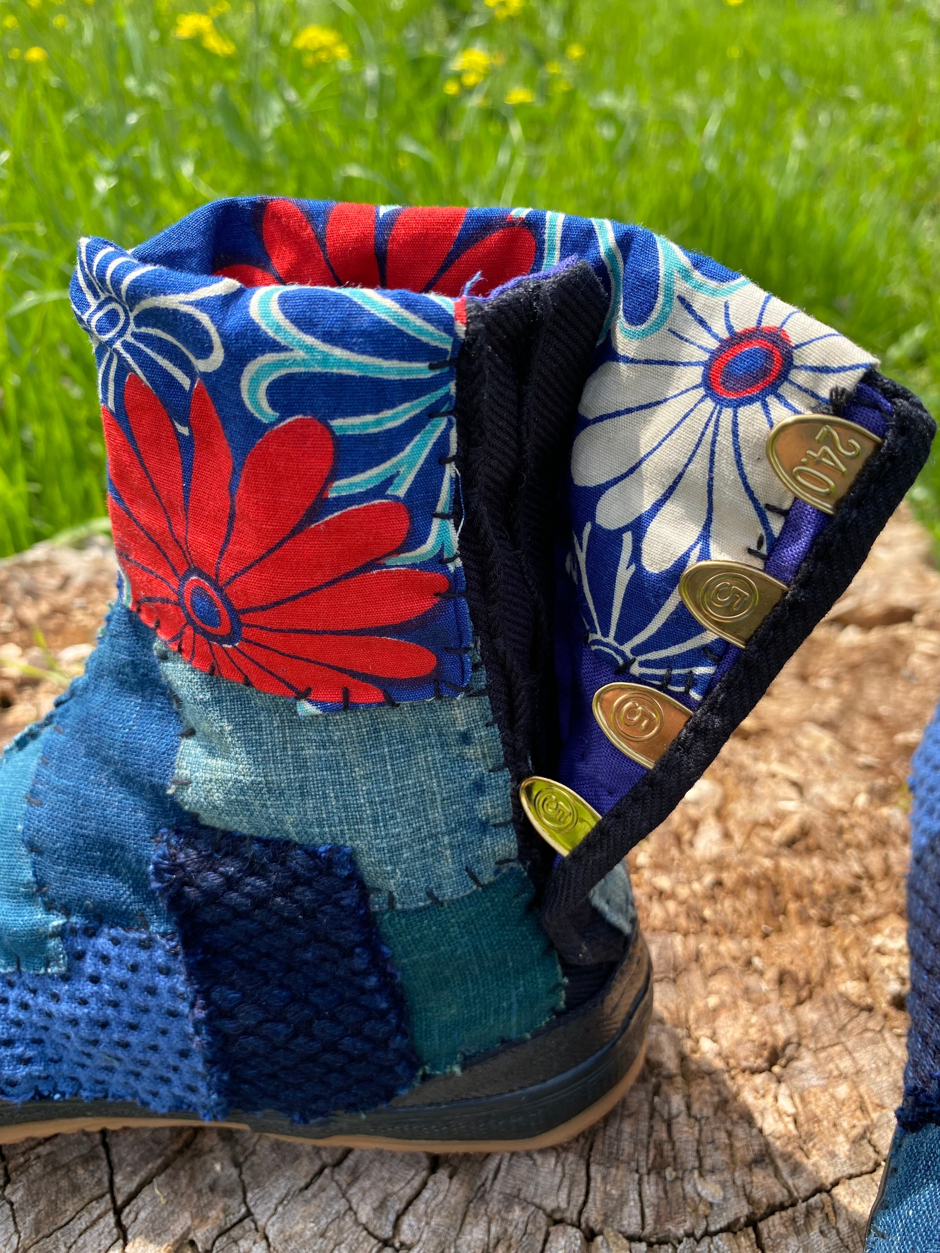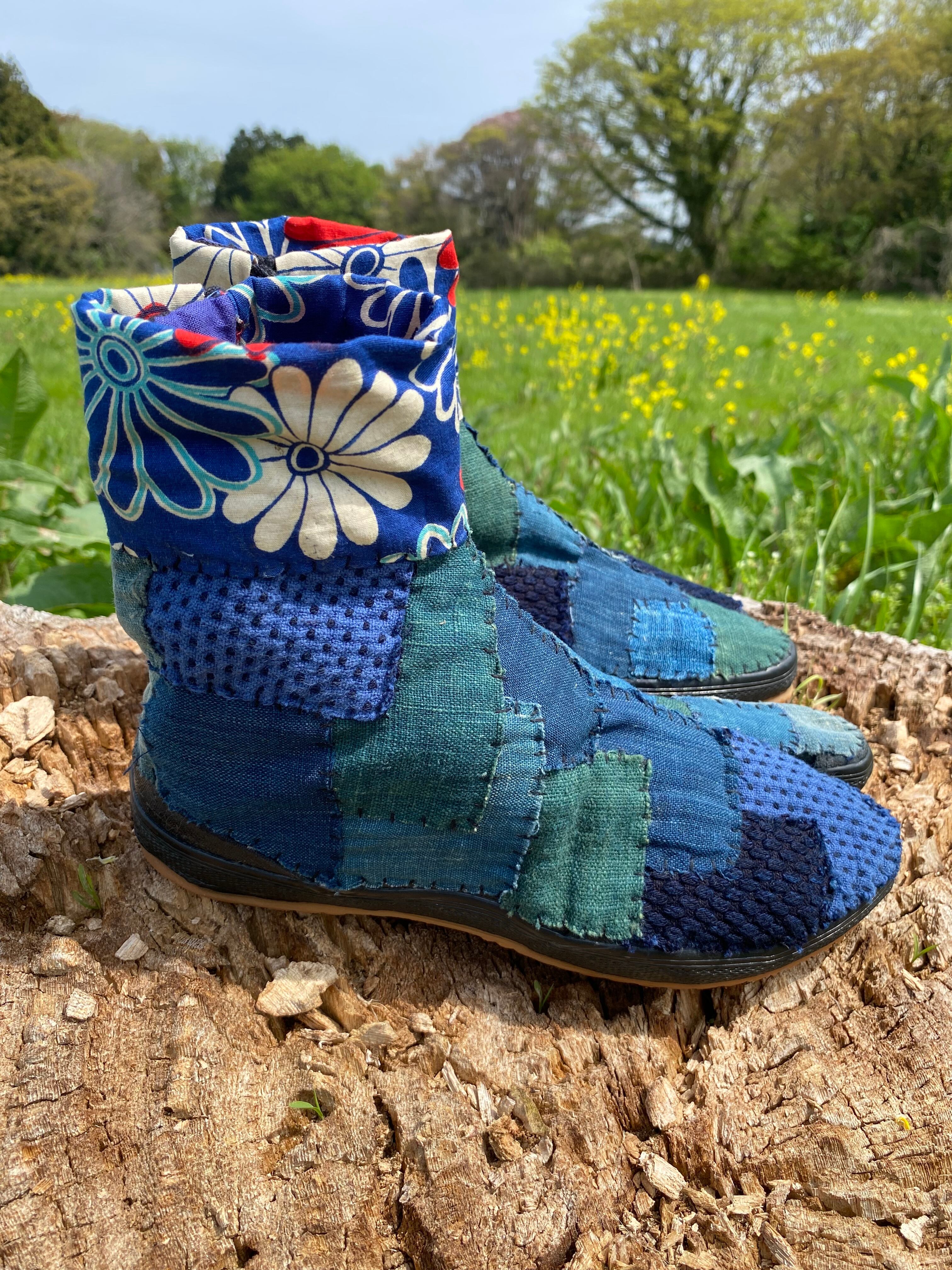 古い藍染めや絣生地を地下足袋にパッチワークし刺し子を一点一点手作業で施しております。