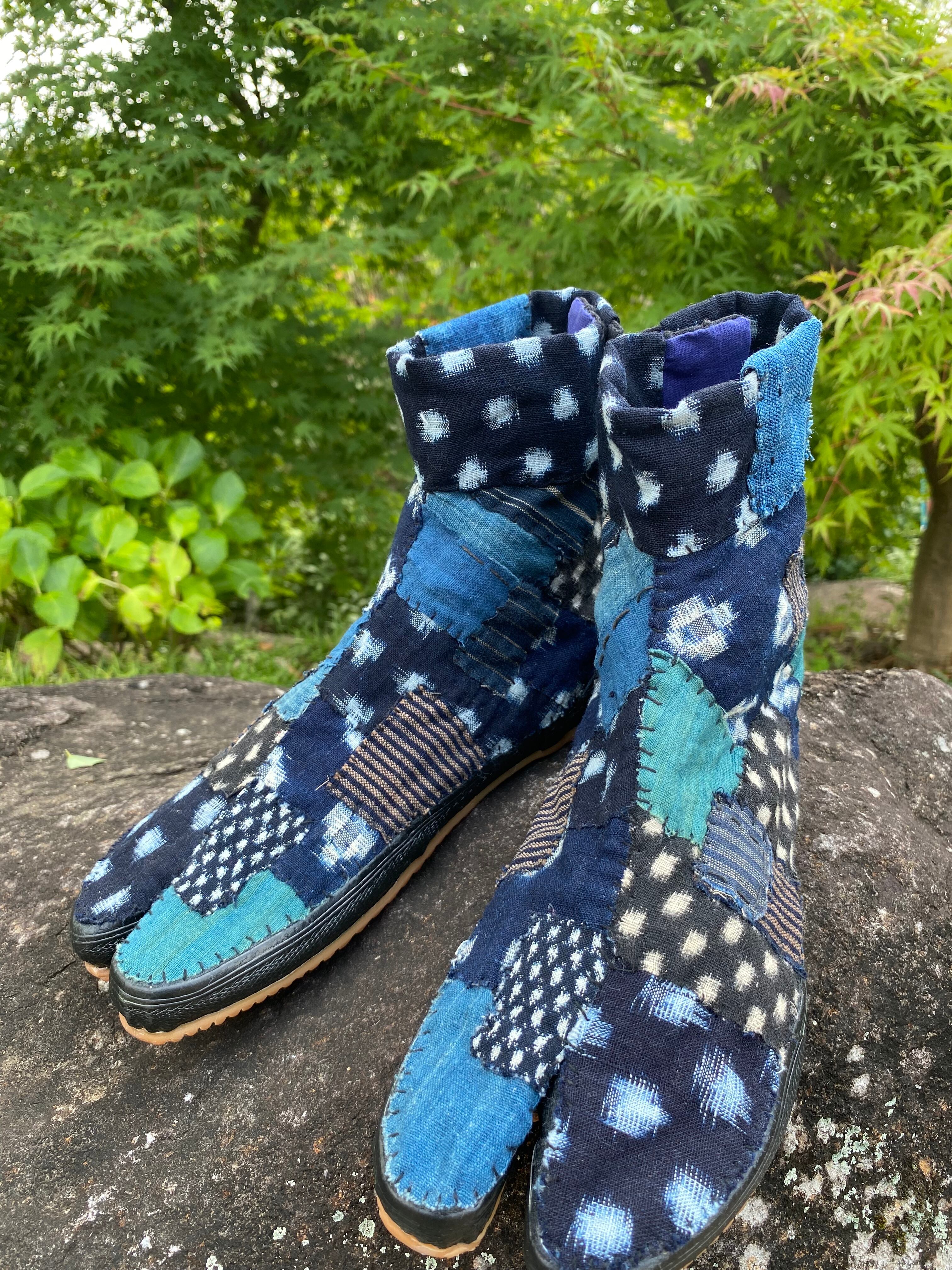 古い藍染めや絣生地を地下足袋にパッチワークし刺し子を一点一点手作業で施しております。