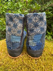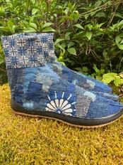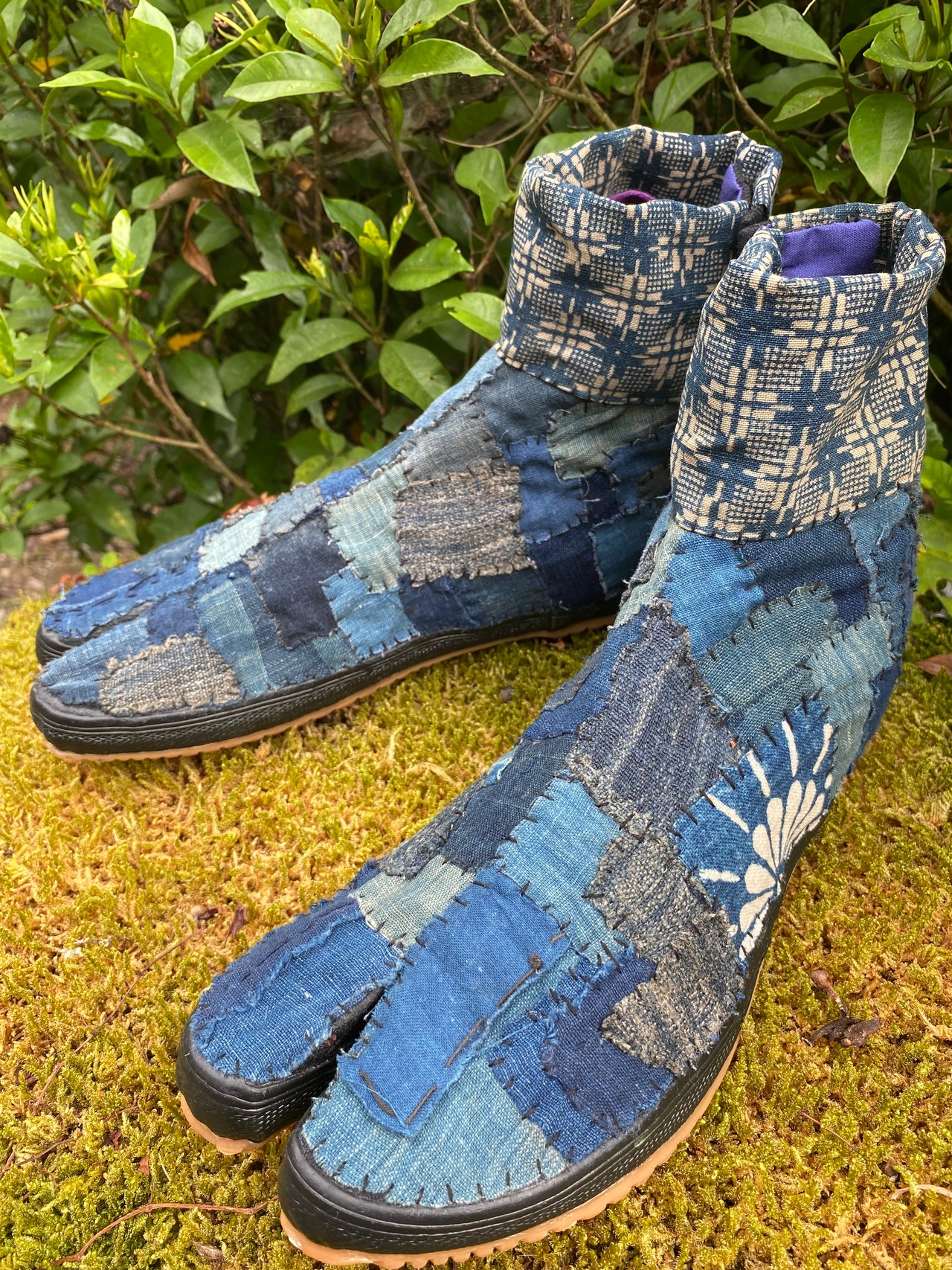古い藍染めや絣生地を地下足袋にパッチワークし刺し子を一点一点手作業で施しております。
