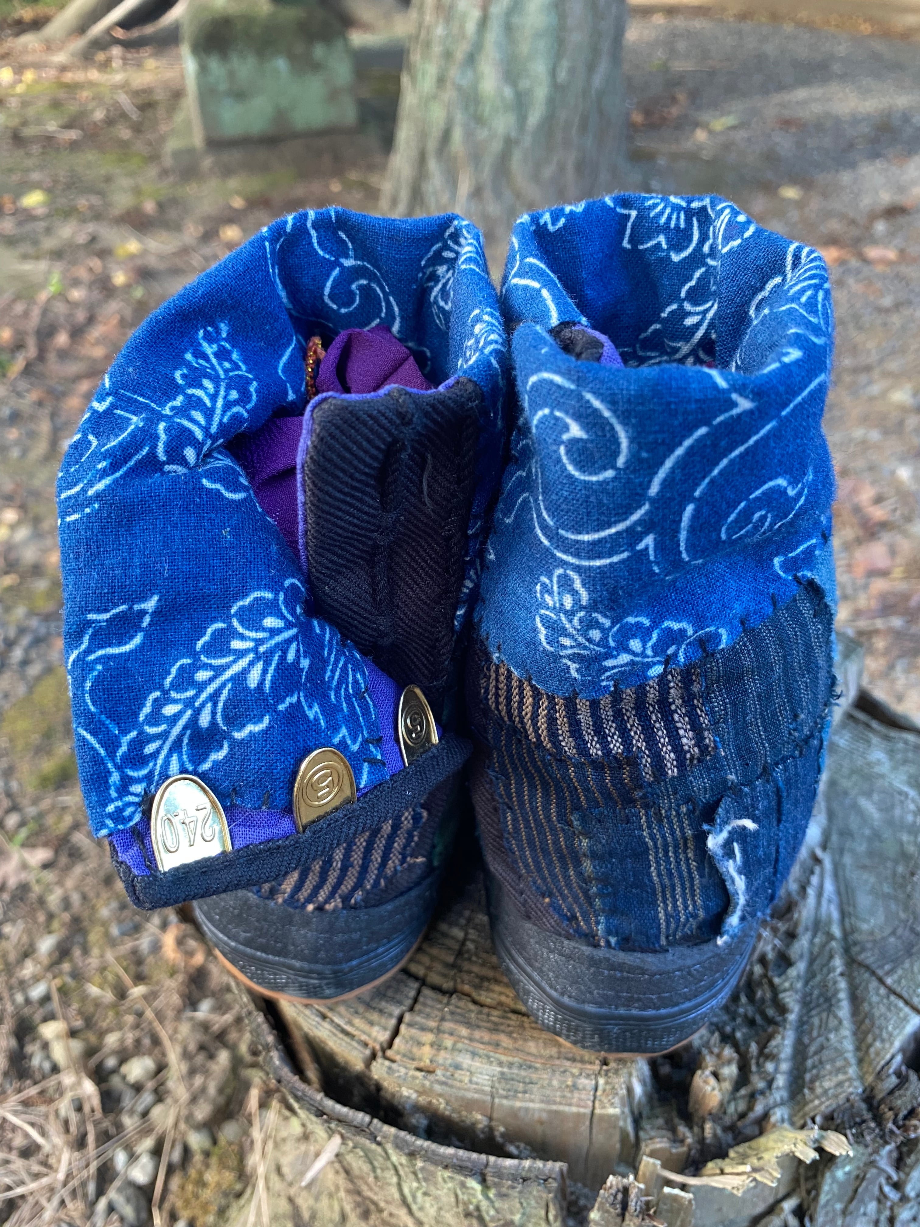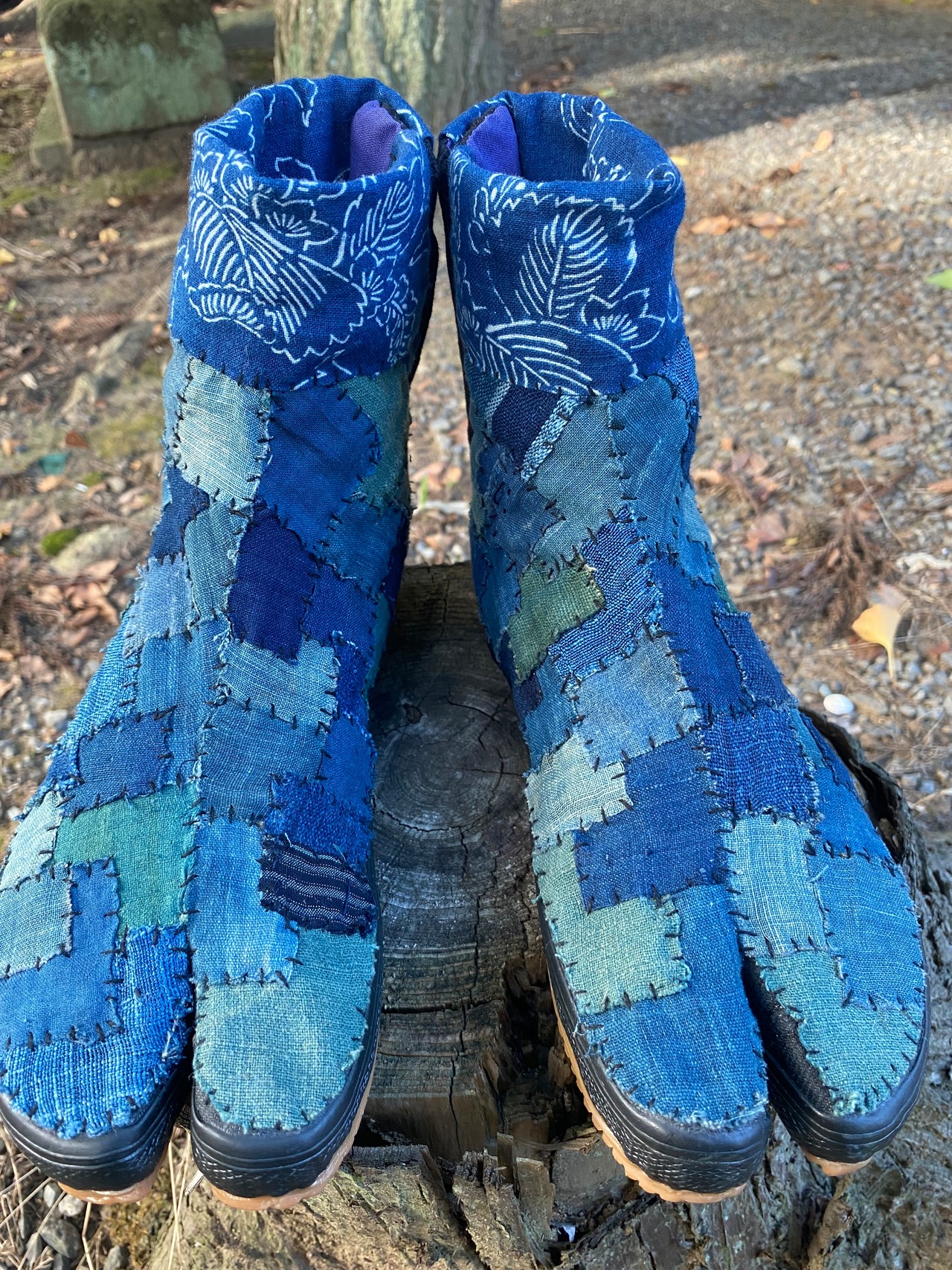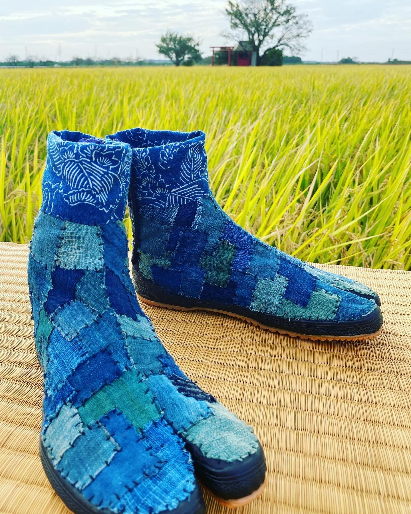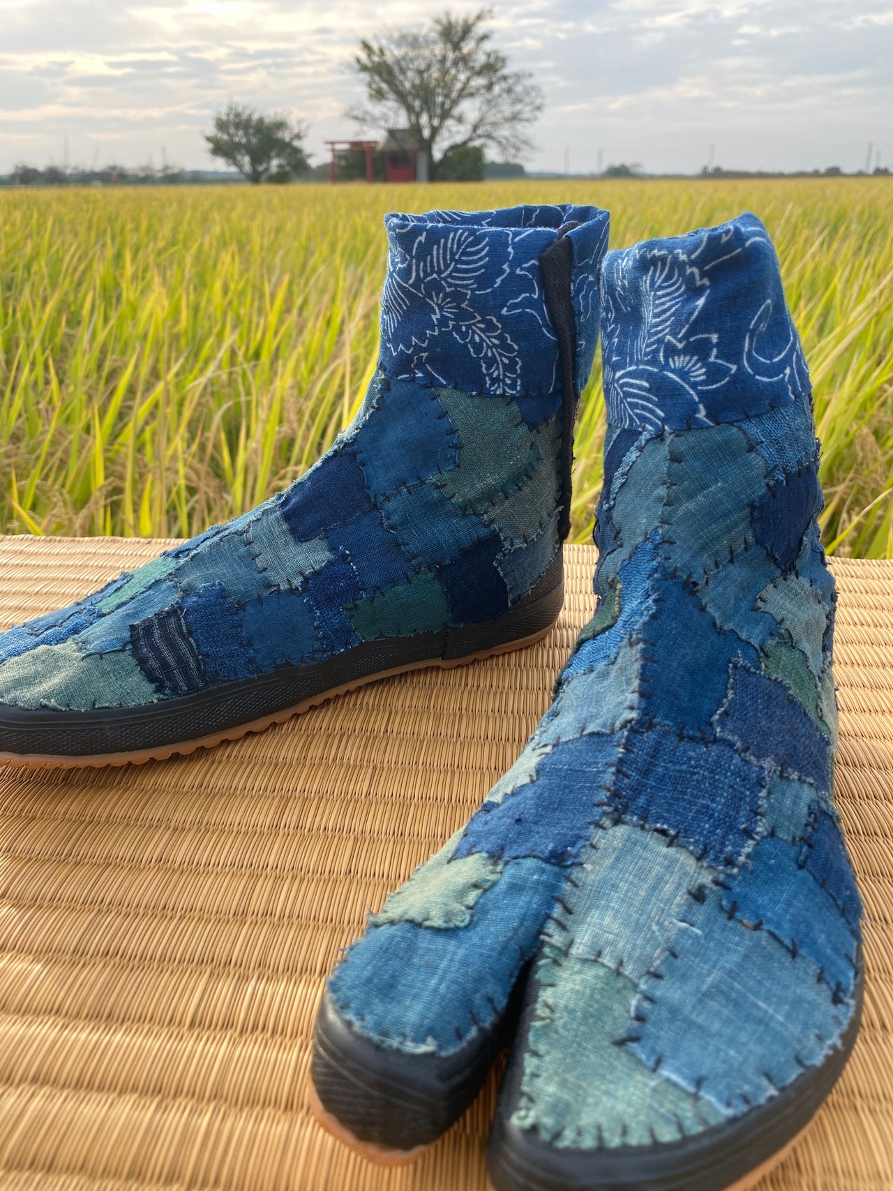 古い藍染めや絣生地を地下足袋にパッチワークし刺し子を一点一点手作業で施しております。
