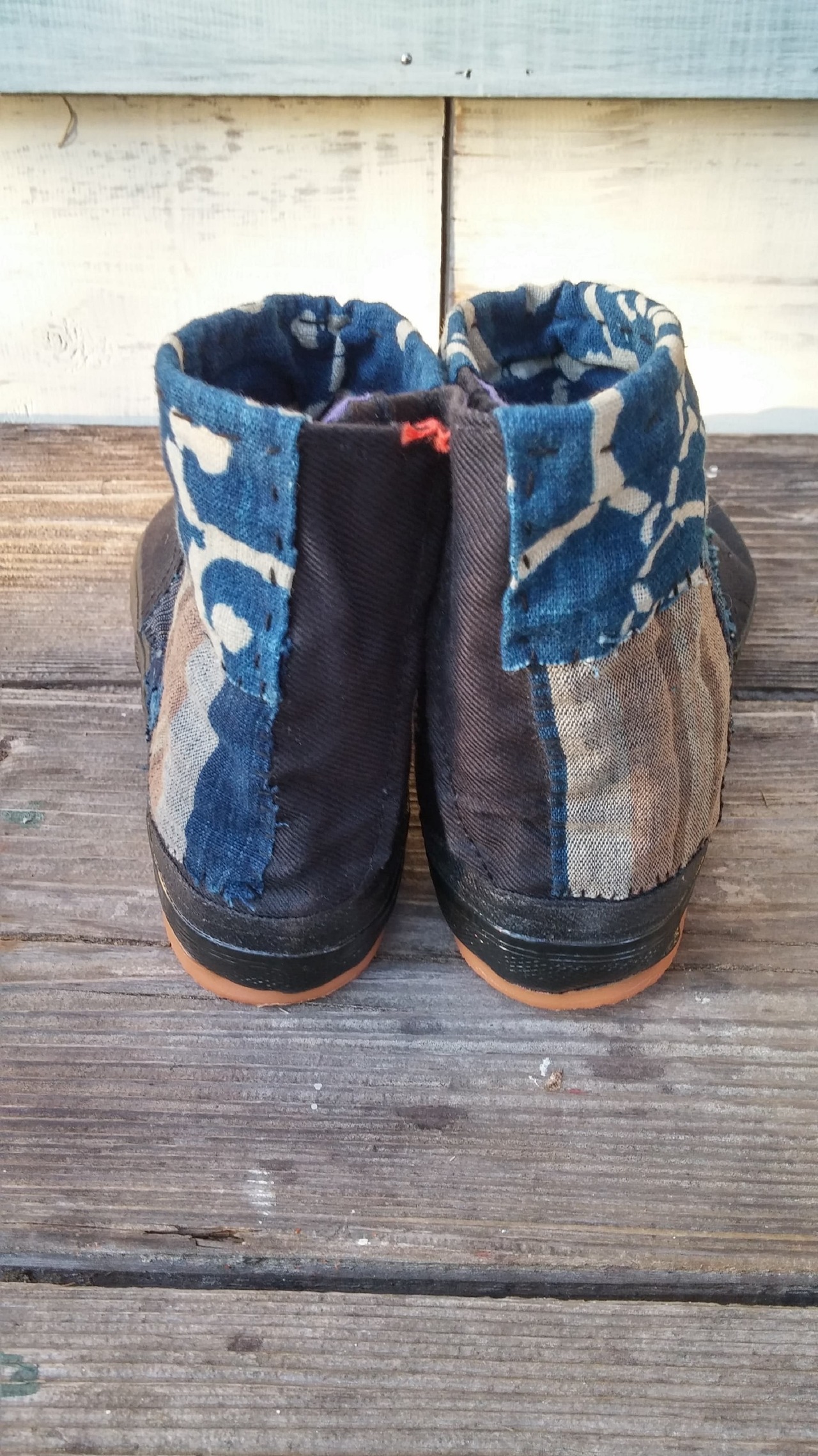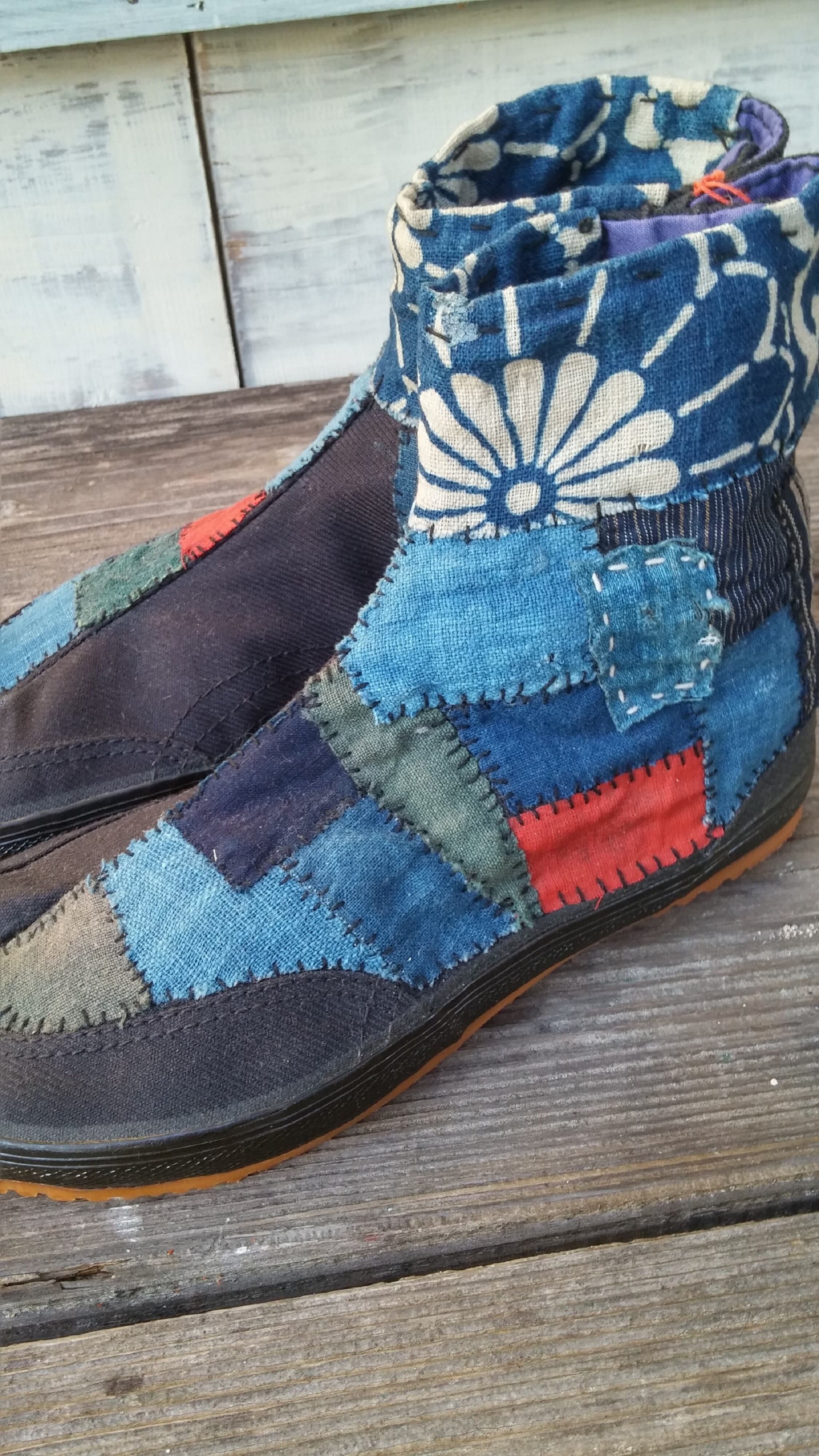日本の古い藍染めや絣生地を地下足袋にパッチワークし刺し子を一点一点手作業で施しております。