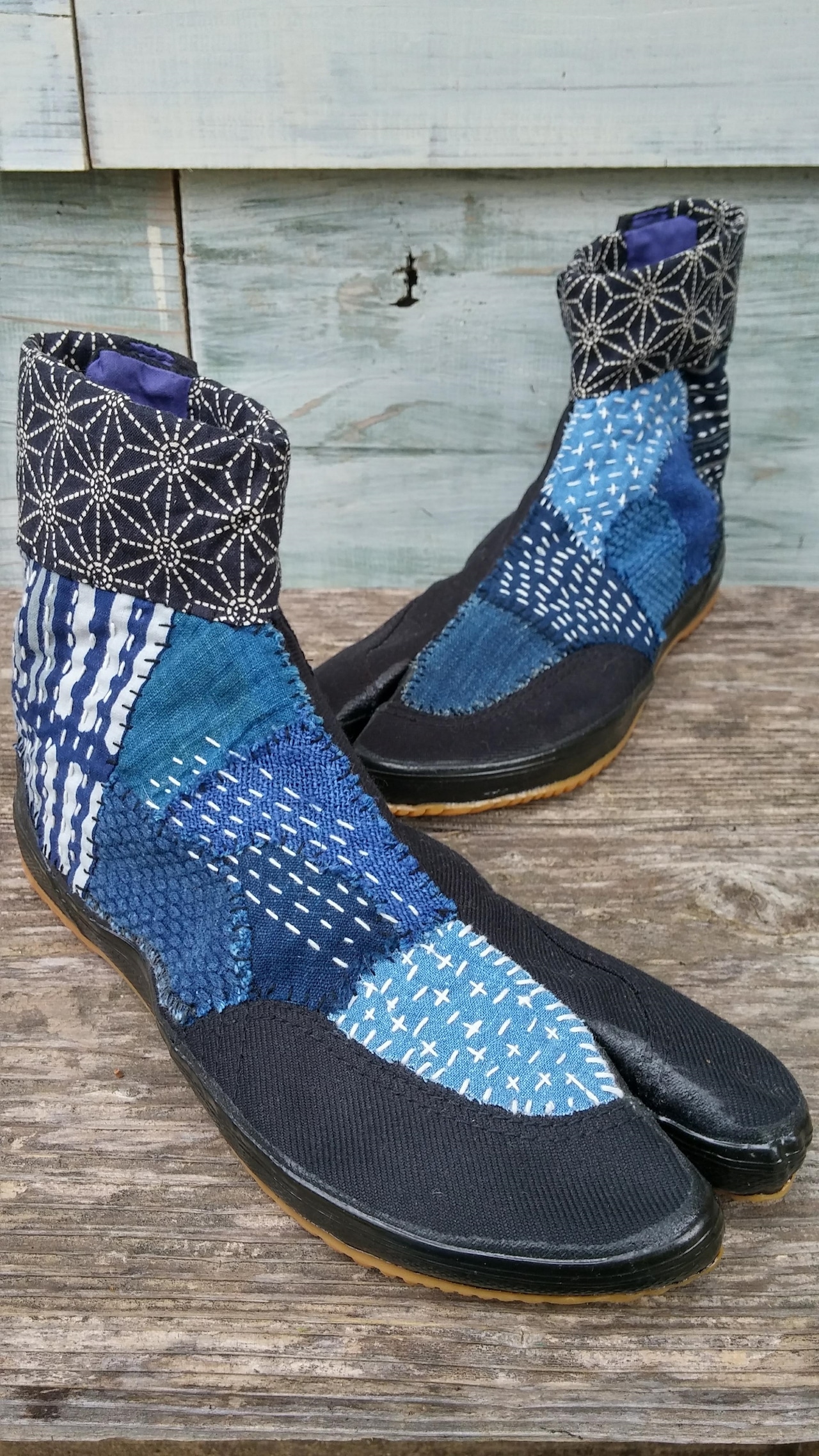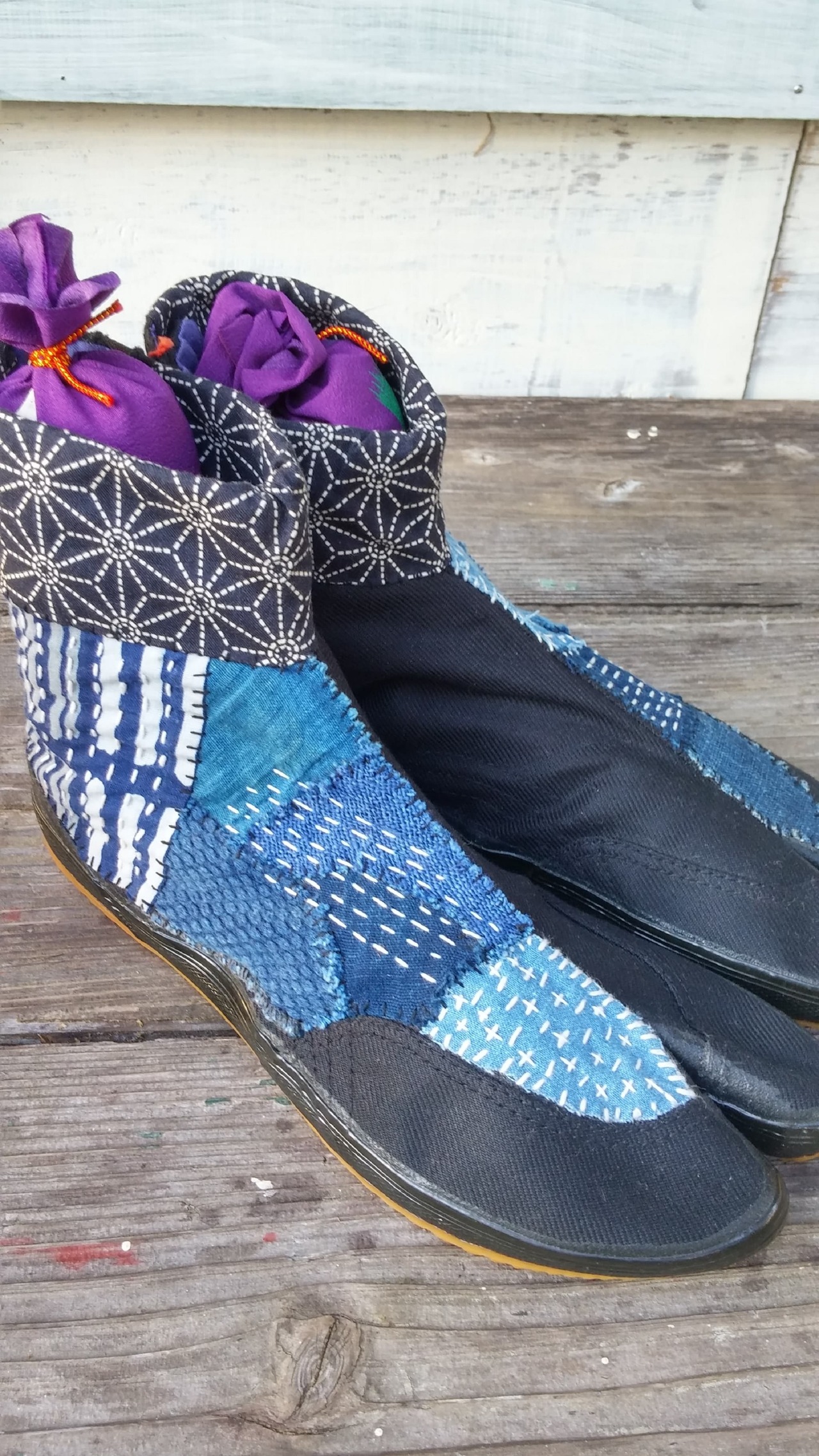 日本の古い藍染めや絣生地を地下足袋にパッチワークし刺し子を一点一点手作業で施しております。